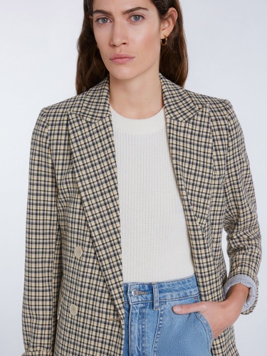 Клетчатый жакет прямого кроя. Отложной воротник с лацканами, застежка на пуговицы. Втачной рукав полной длины. Боковые карманы с клапаном.