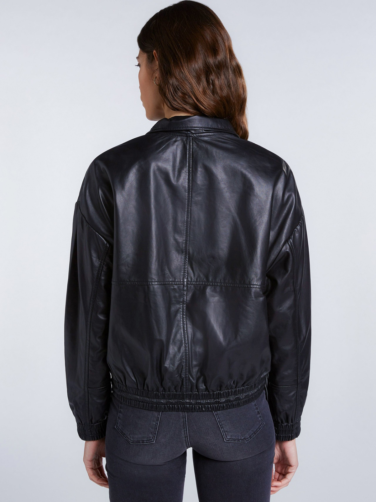 Куртка свободного силуэта из натуральной кожи. Воротник стойка, спущенная линия плеча, втачной рукав полной длины с манжетой. Боковые карманы, эластичный пояс по низу изделия.