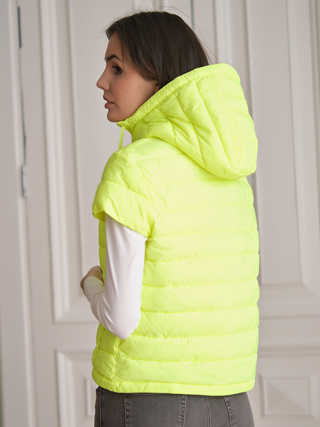 Неоновая стёганная куртка с коротким рукавом – яркий, привлекающий всеобщее внимание элемент образа. Застежка на молнию. Воротник стойка, глубокий капюшон. Кулиска по низу изделия.