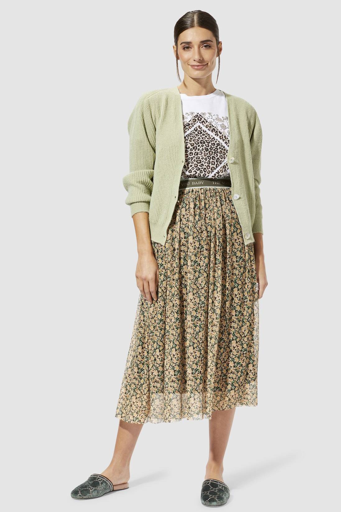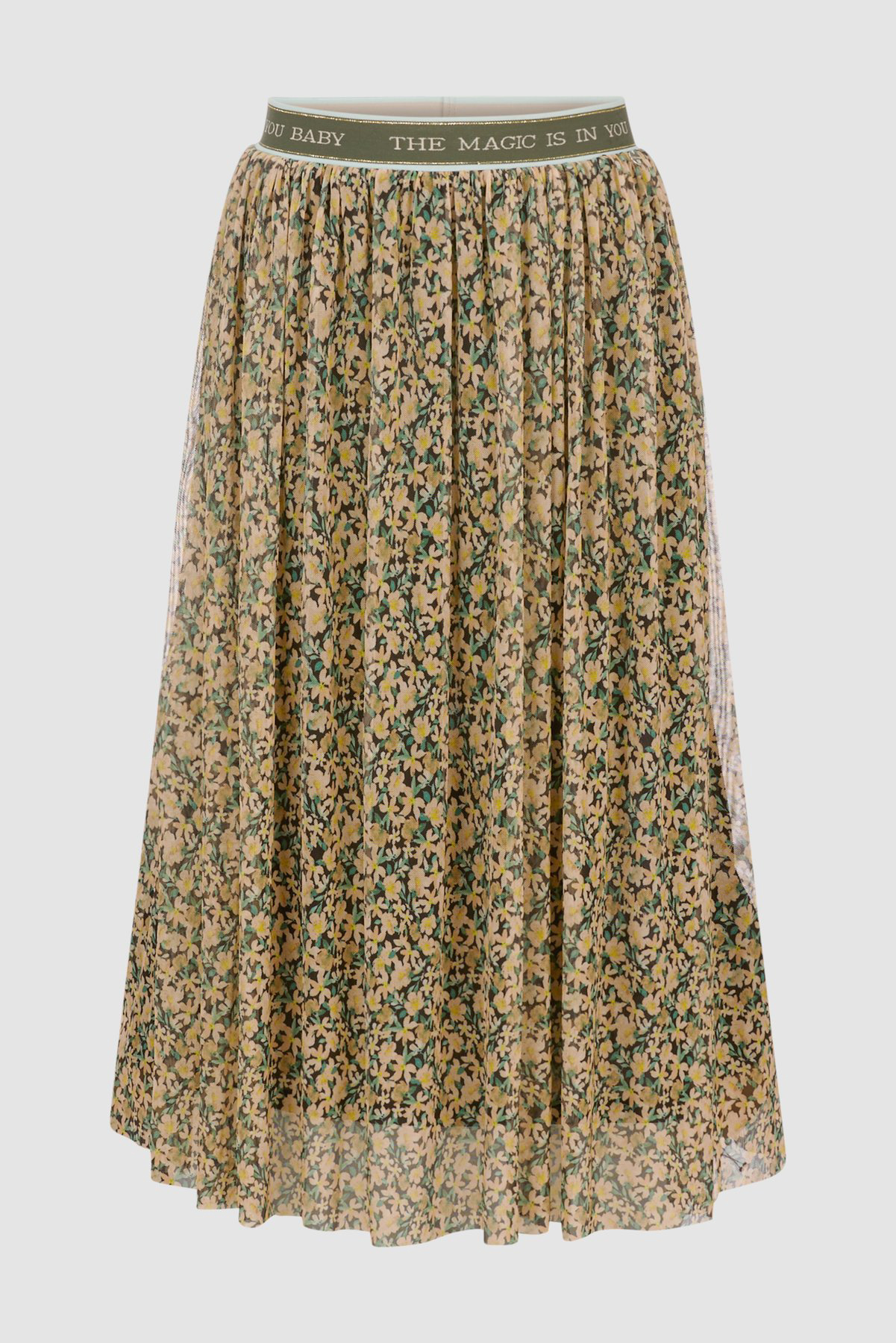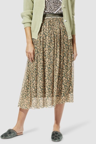 Двуслойная шифоновая юбка длины миди выполнена в цветочном узоре. Эластичный пояс обеспечивает комфортную посадку и удобство повседневного ношения.
