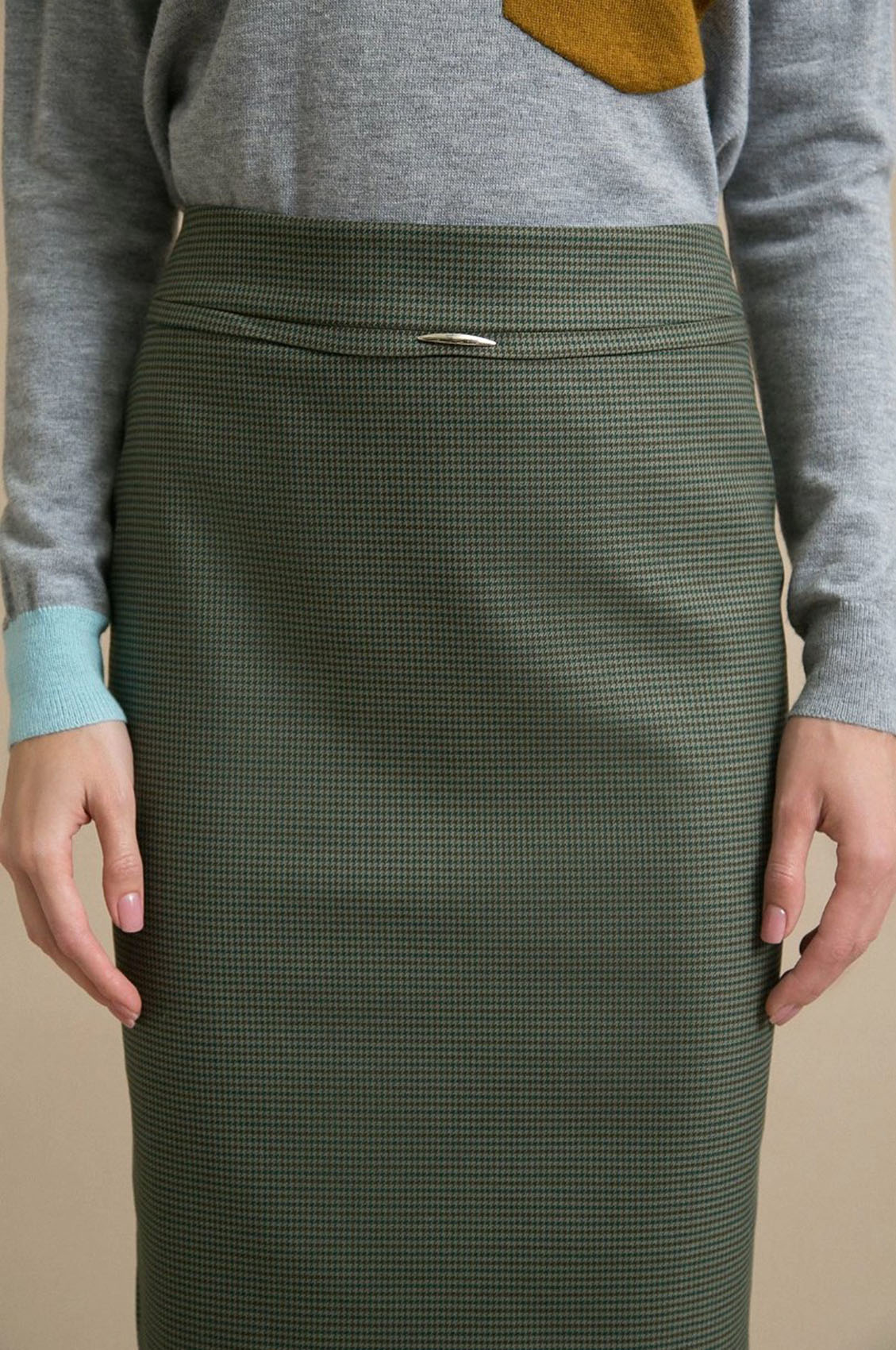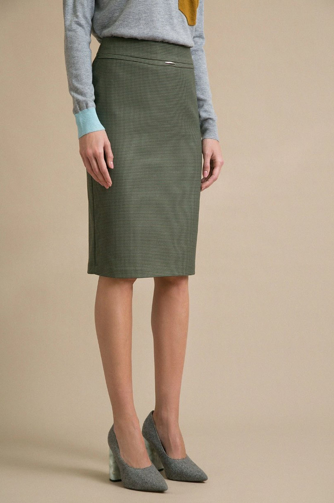 Юбка-карандаш с орнаментом "гусиная лапка". Модель имеет притачной пояс с металлическим элементом и потайную застежку-молнию сзади в среднем шве. Юбка декорирована сзади веерной складкой. Удачный выбор для создания повседневных и деловых образов.