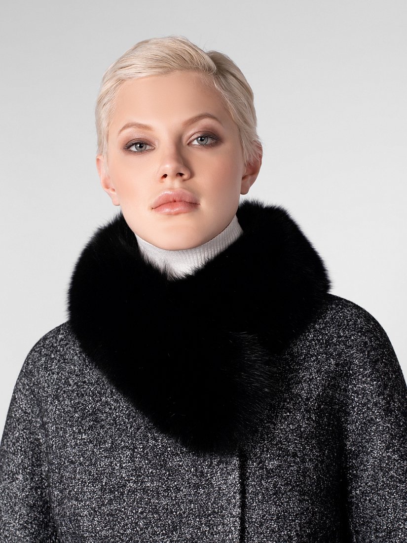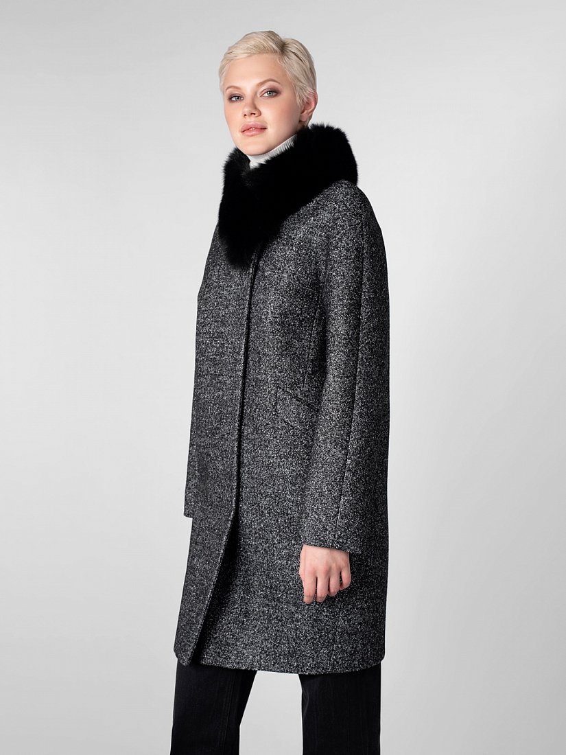 Пальто прямого силуэта "кокон" из чёрно-белой варёной шерсти. Длина выше колена. Рукава-кимоно, карманы-листочки, плосколежащий воротник-стойка, застёжка на пришивные кнопки. Съёмный меховой воротник из натурального песца. Пальто с ветрозащитной мембраной Raft Pro. Утеплитель DuPont Sorona из биопуха.