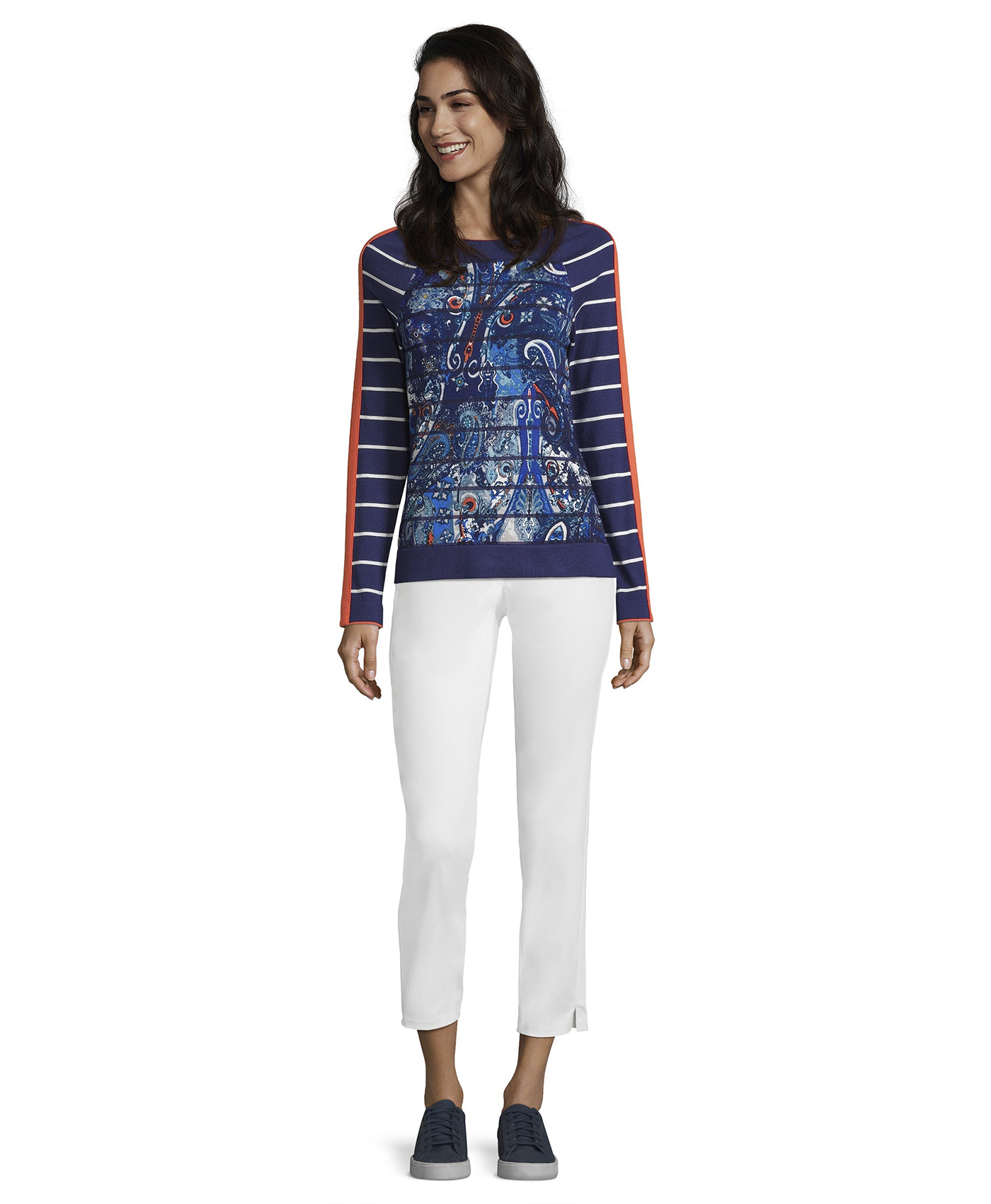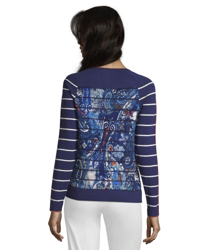 Смелое сочетание полоски и этнического принта обращает на себя внимание! Джемпер слегка приталенного силуэта с горловиной-лодочкой. Длинные рукава реглан. Материал из вискозной смеси приятен к телу и обеспечивает комфорт. Этот джемпер гарантирует современный образ в сочетании с любым однотонным вариантом низа.