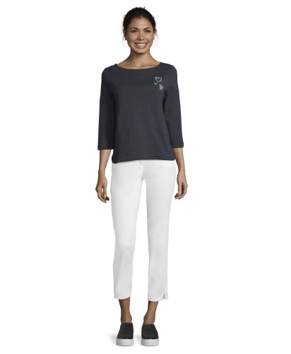 Джемпер прямого покроя с вырезом "лодочка" и рукавами 3/4. Декоративные элементы в форме сердец создают нежный, женственный образ обладательницы джемпера. Хлопковый материал джемпера чрезвычайно уютен. Эта модель отлично смотрится как с брюками, так и с юбкой.