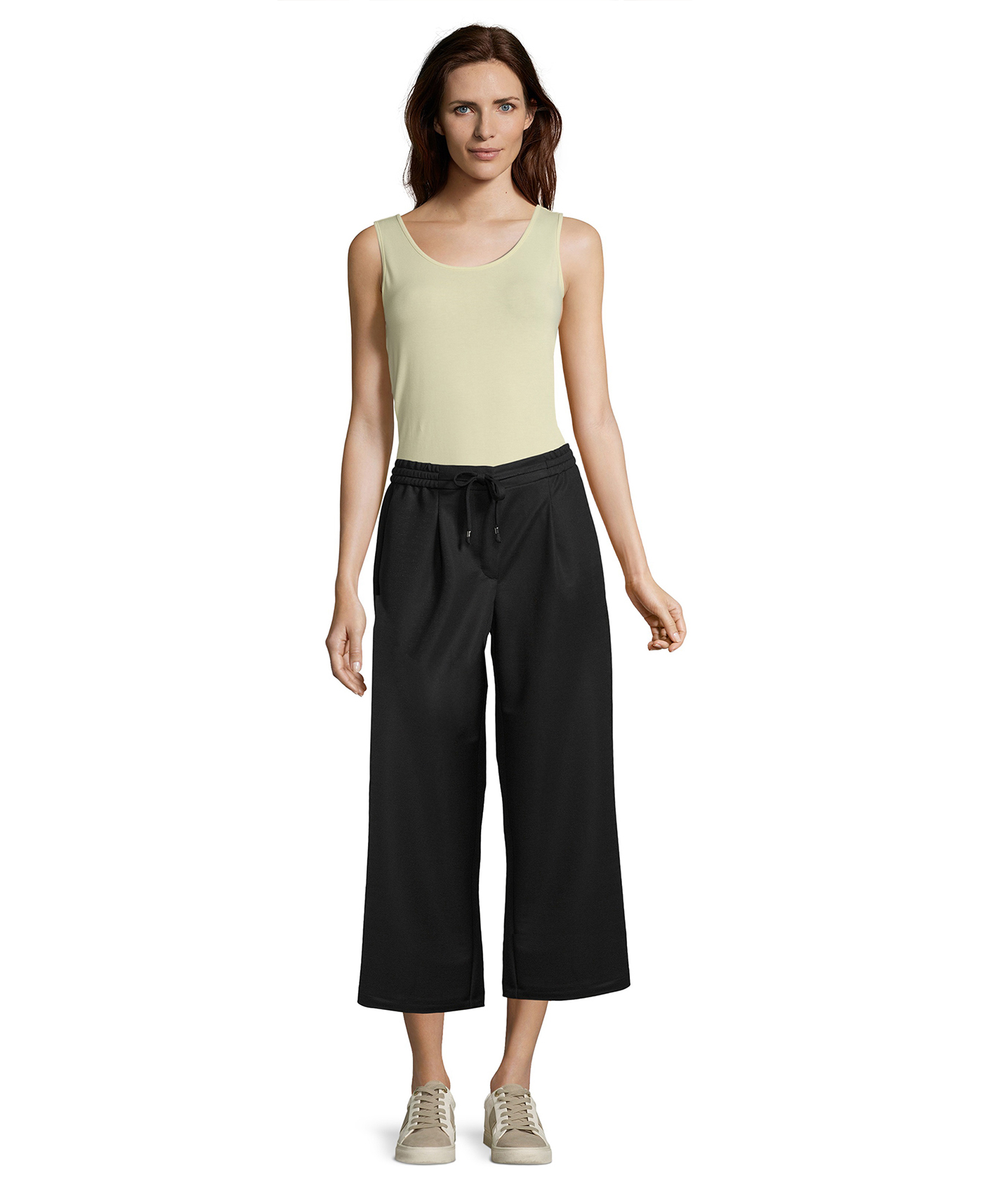 Свободный силуэт в моде! Брюки с защипами. Укороченная длина брюк позволяет подчеркнуть модную обувь. Эластичный пояс на кулиске. Приятный к телу материал из вискозной смеси. Эти брюки просто необходимы для создания трендового образа.