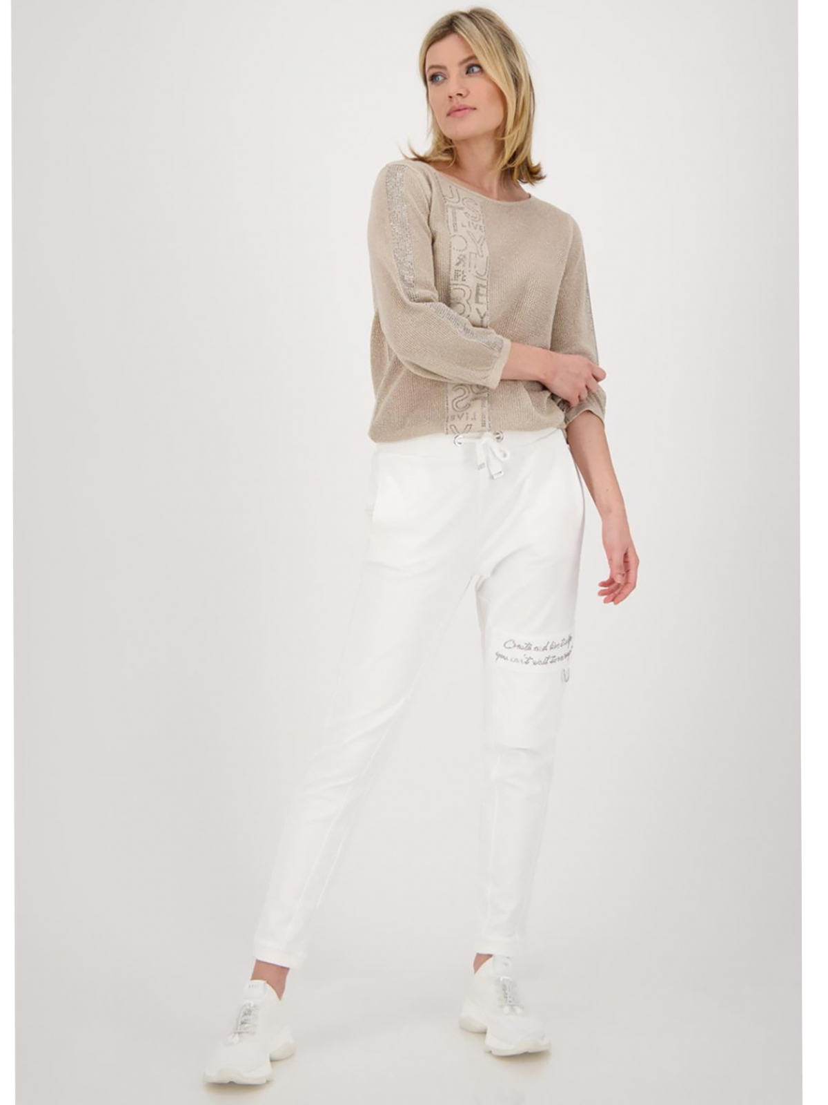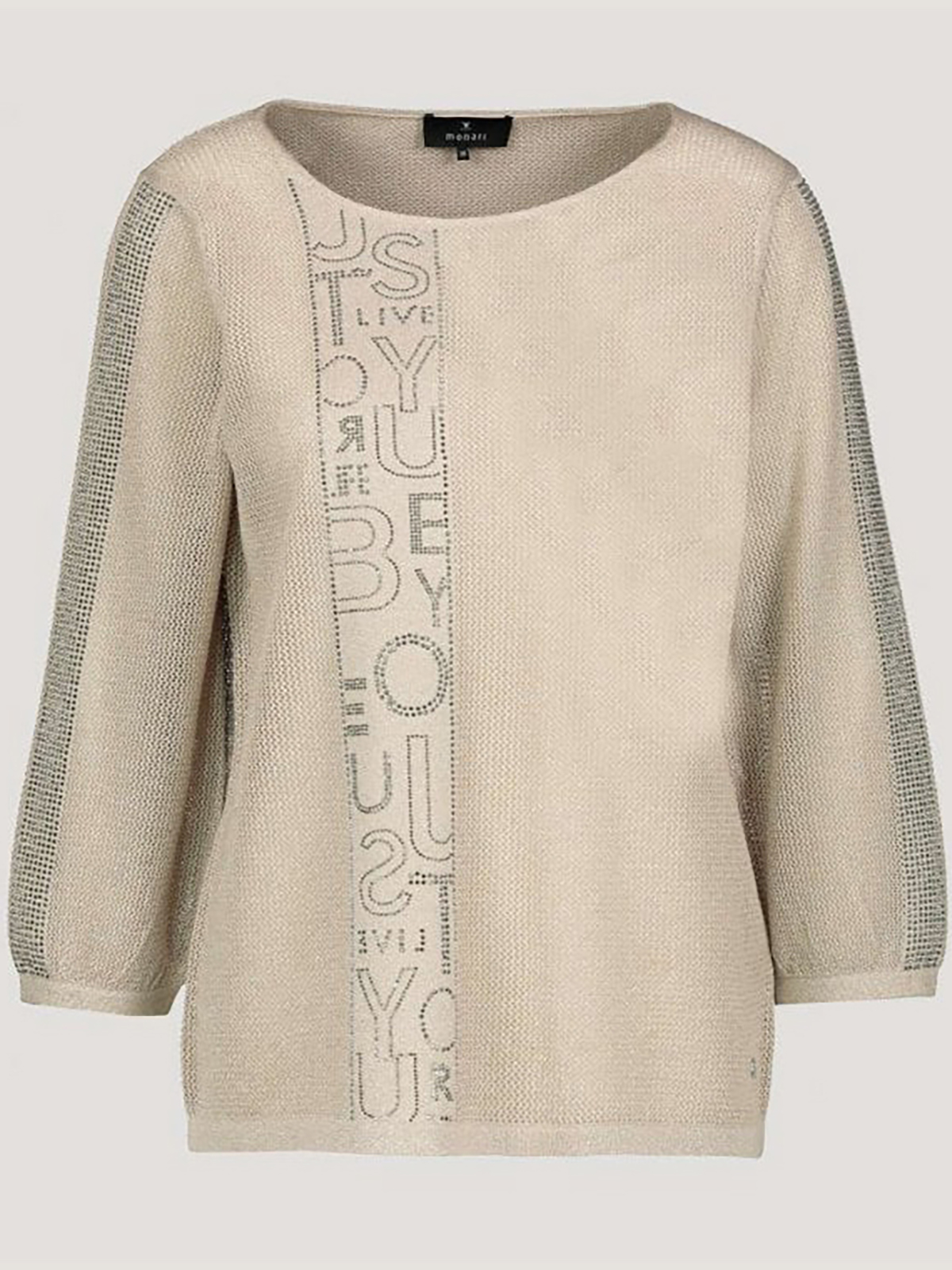 Полупрозрачный пуловер из сетки крупной вязки с текстовым принтом. Втачной рукав полной длины, горловина-лодочка.