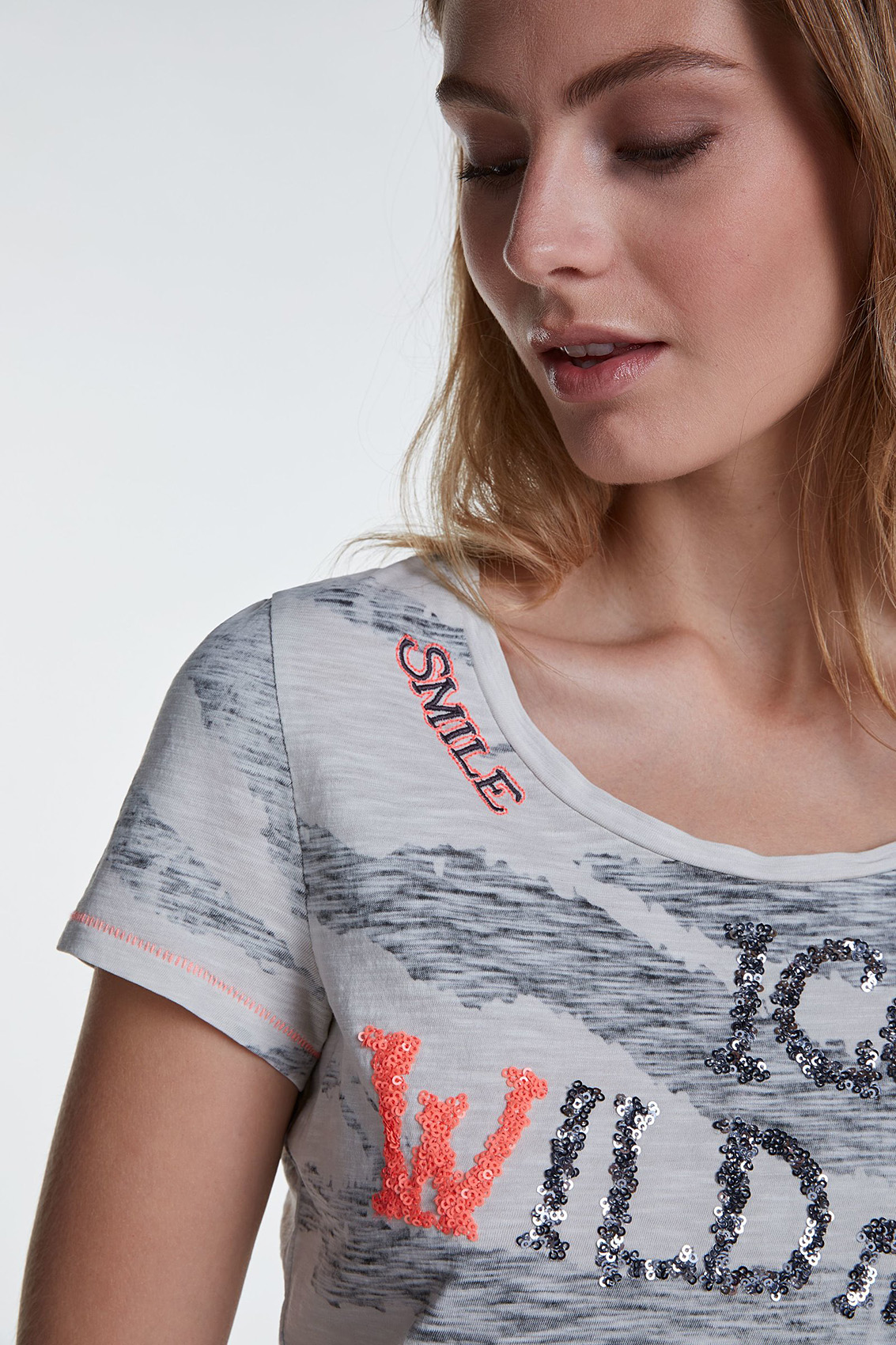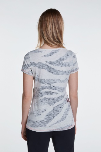 Футболка полуприлегающего силуэта с анималистическим принтом и пайетками. Круглый вырез горловины, короткие втачные рукава, декоративная отстрочка контрастного цвета. Приятный к телу хлопковый материал обеспечивает комфорт.