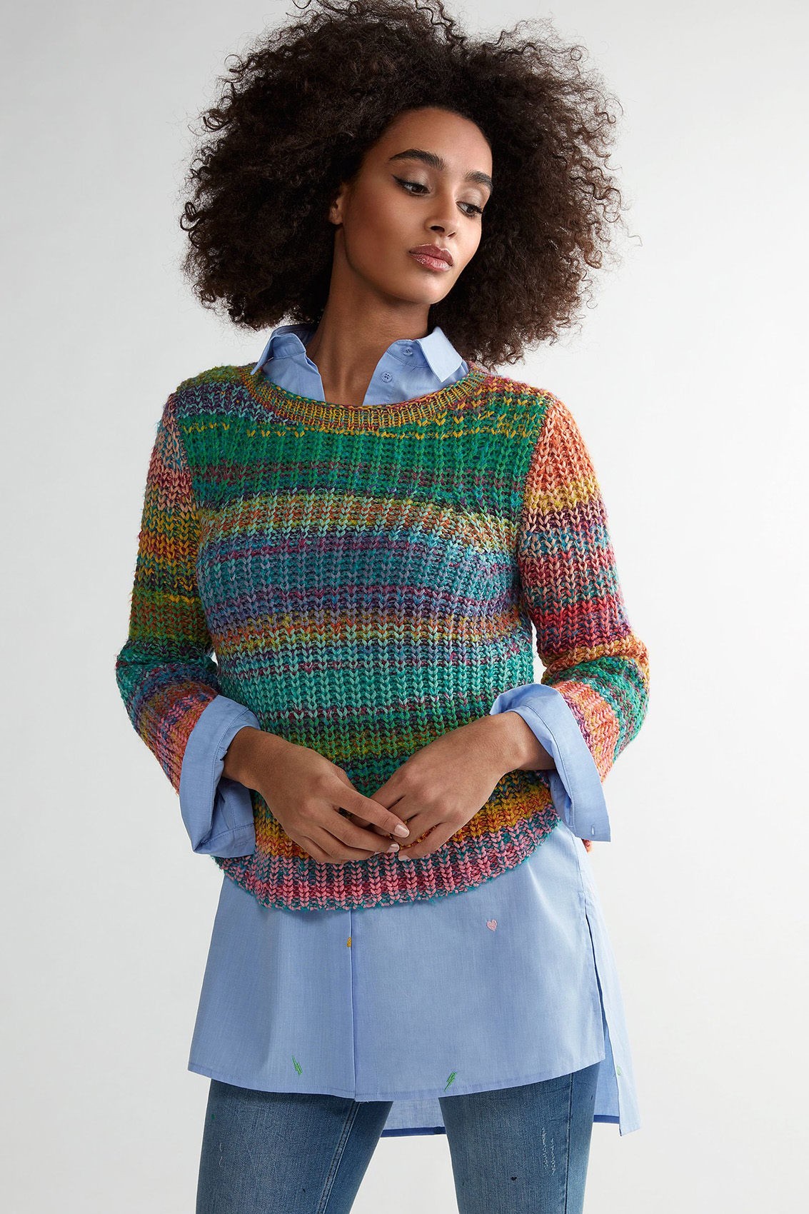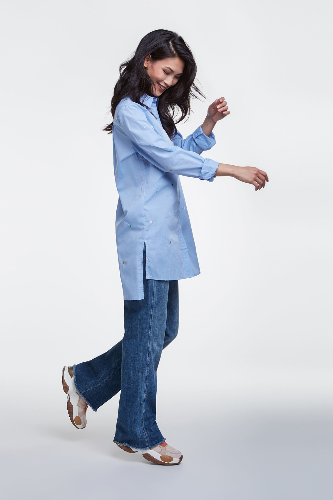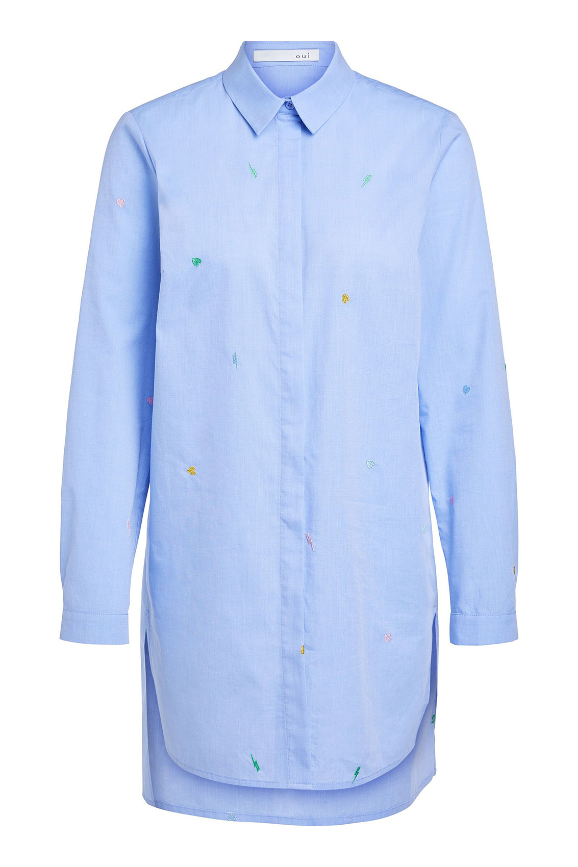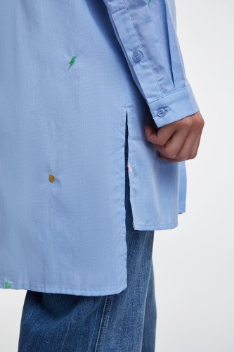 Удлиненная блуза - изюминка коллекции! Прямой покрой, отложной воротничок, застежка на пуговицах, длинные рукава. Удлиненная спинка изделия, разрезы по бокам. Ткань с вышитыми элементами. Эта блуза в стиле кэжуал предполагает огромное множество модных интерпретаций.