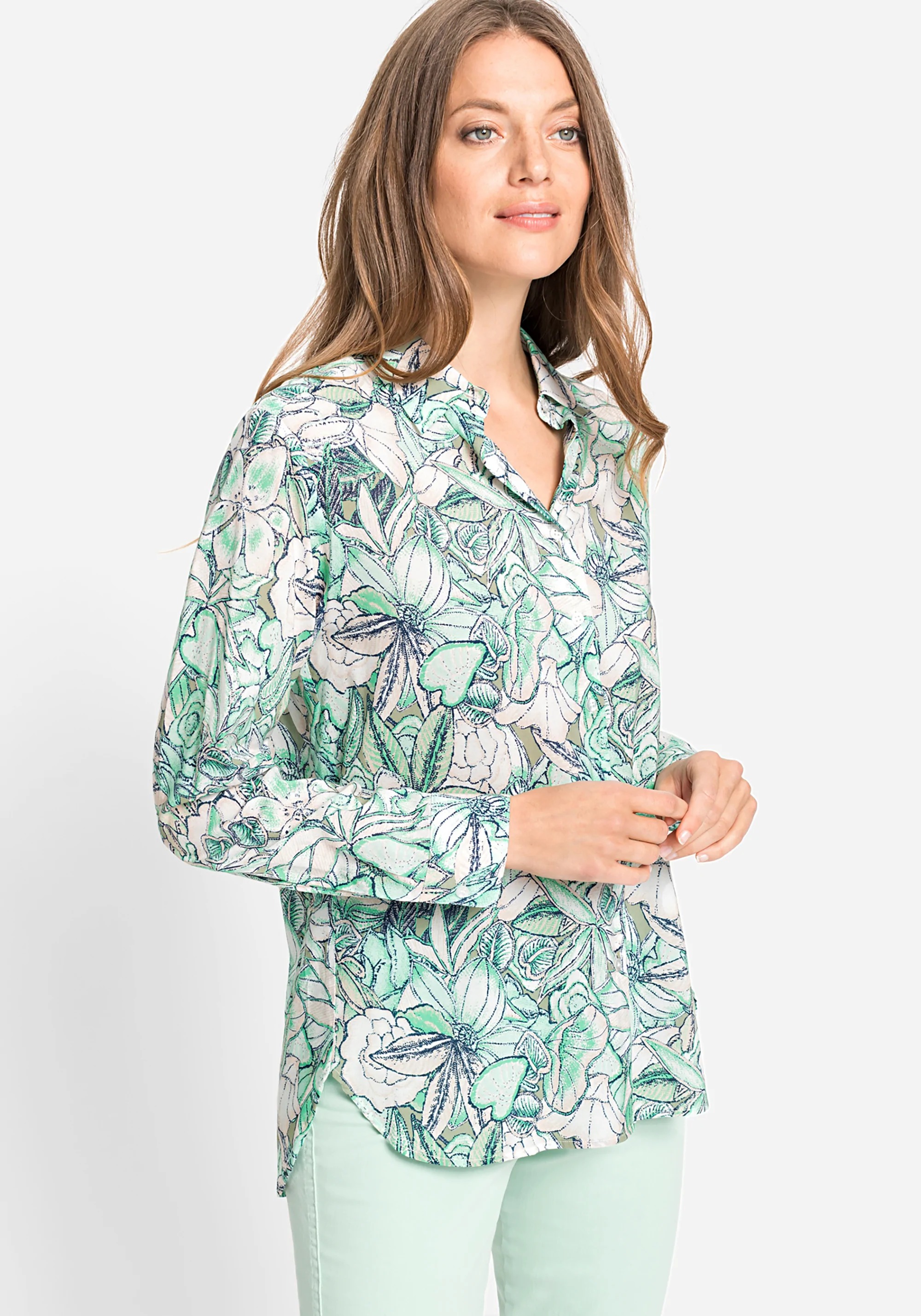На сайте указаны Российские размеры. Блуза с цветочным принтом передает классический силуэт и утонченный стиль с воротником, сплошной планкой на пуговицах и манжетами на пуговицах. Блузка сзади немного длиннее, чем спереди.