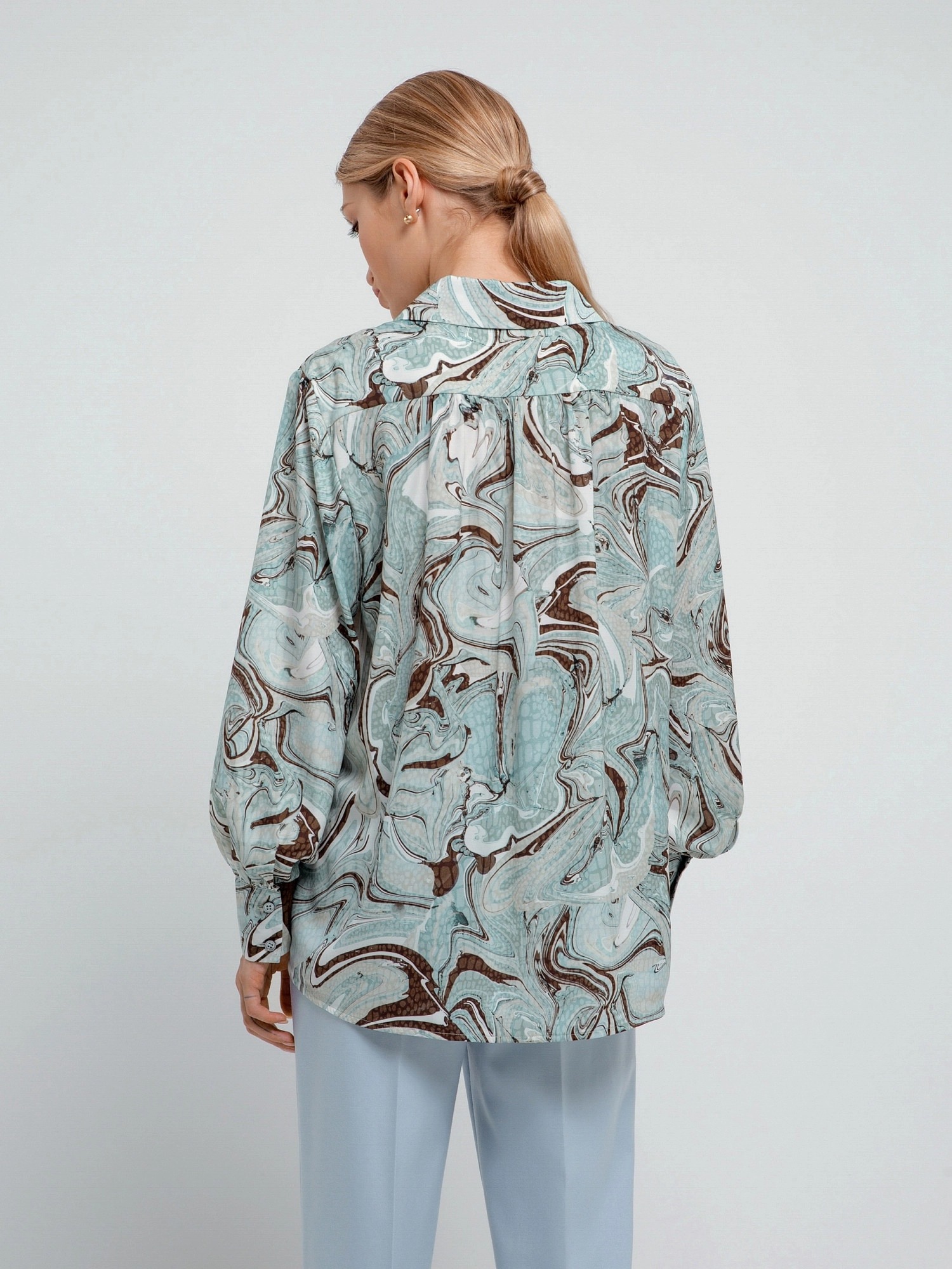 На сайте указаны российские размеры. Романтичная свободная классическая блуза из плательной ткани с абстрактным принтом. Идеальное дополнение для создания комплекта с юбкой из этой же ткани. Рост модели 175 см.
