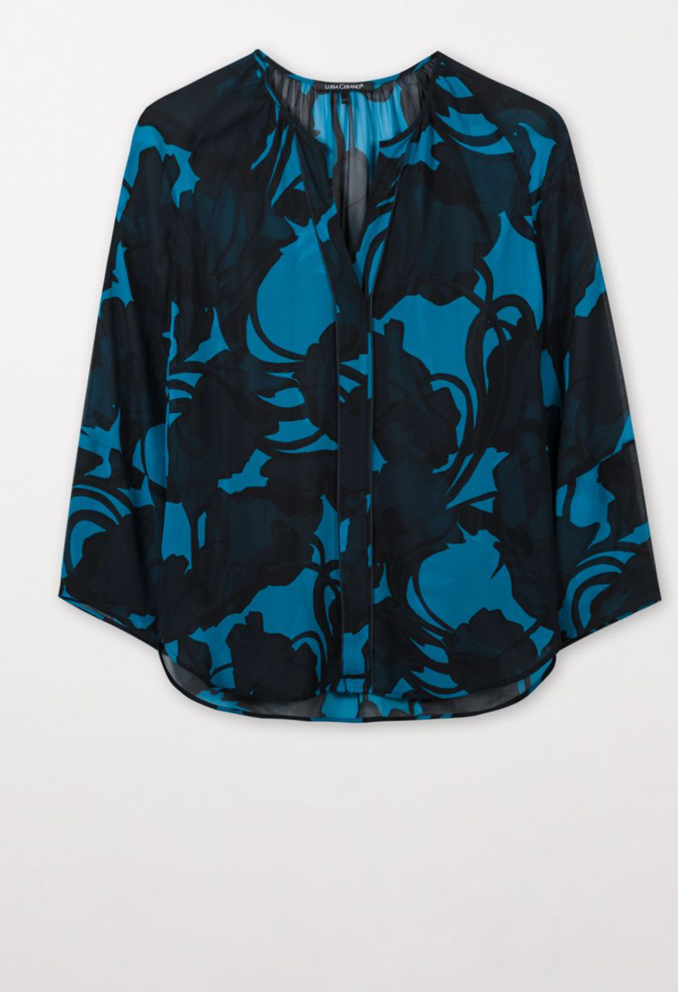 Легкая блузка из полупрозрачного вискозного крепа с эксклюзивным абстрактным цветочным мотивом. Вырез с фестонами и рукава длиной ¾ завершают образ.