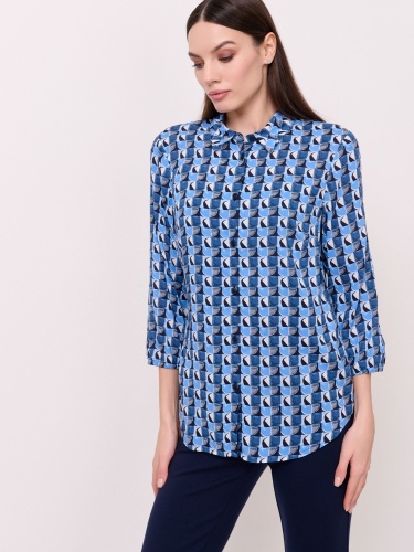 Детали: застежка пуговицы, вырез горловины отложной воротничок, рукава длинные, покрой рубашечный, рисунок орнамент. Длина по спинке: 65 см.