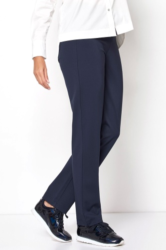 Синие брюки прямого кроя – элегантный и комфортный вариант низа, идеально подходит для делового стиля. Эластичный пояс обеспечивает удобство носки и комфортную посадку. Состав из вискозной смеси гарантирует долговечность изделия. Передние прорезные и накладные задние карманы. Милый акцент в виде металлического лейбла-сердечка.