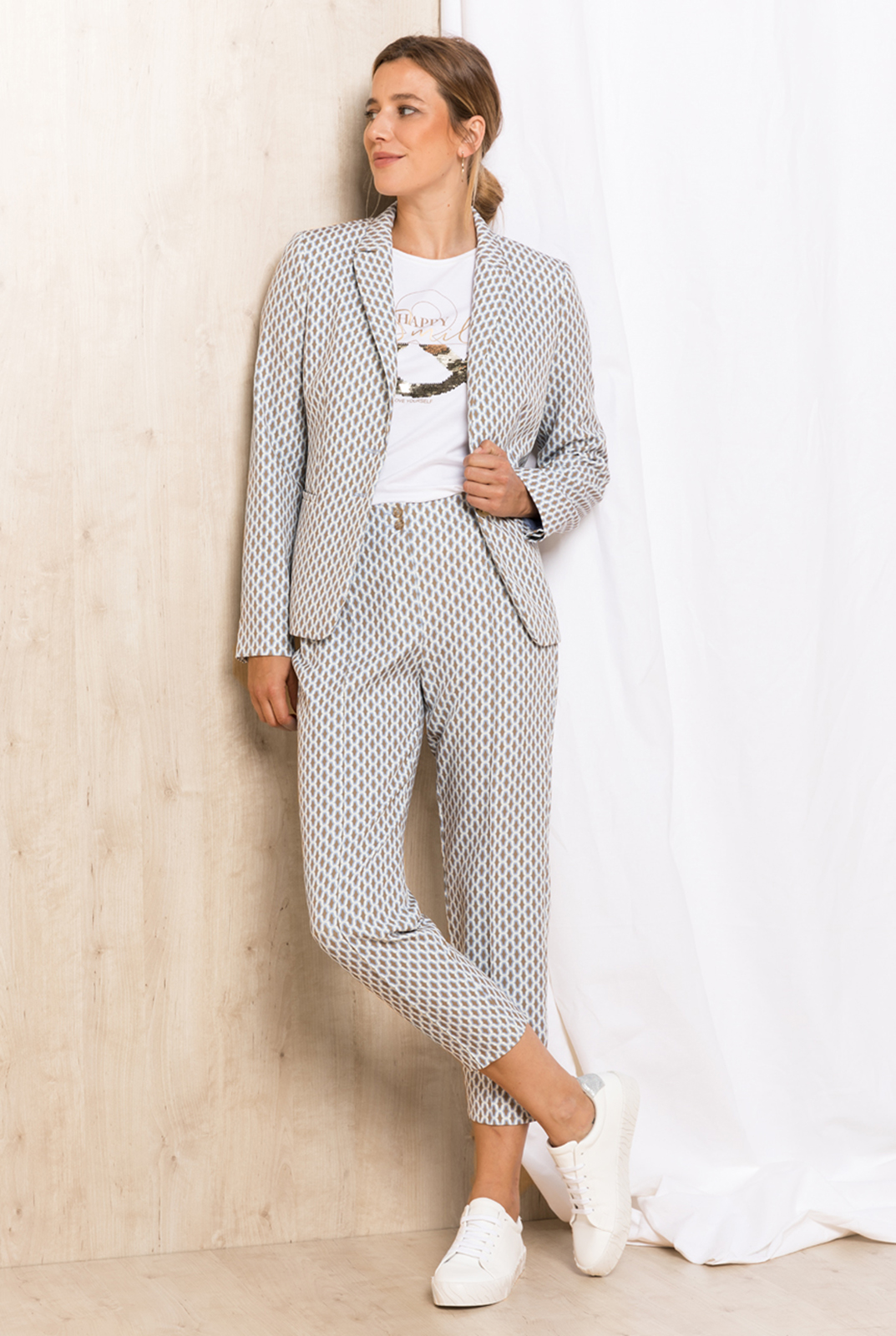 Укороченные брюки в геометрическом узоре – идеально сочетаются с жакетом из того же материала или могут быть самостоятельной деталью образа. Комфортная средняя посадка, пояс без шлевок. Швы спереди на штанинах. Застежка на две пуговицы и скрытую молнию.