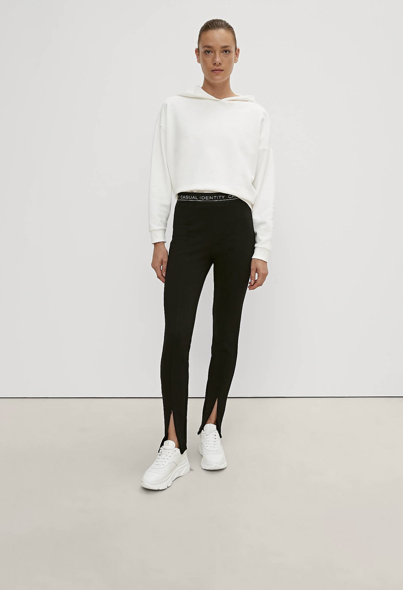 На сайте указаны российские размеры. Спортивные облегающие леггинсы с разрезами спереди. Эластичная резинка-пояс с надписью.