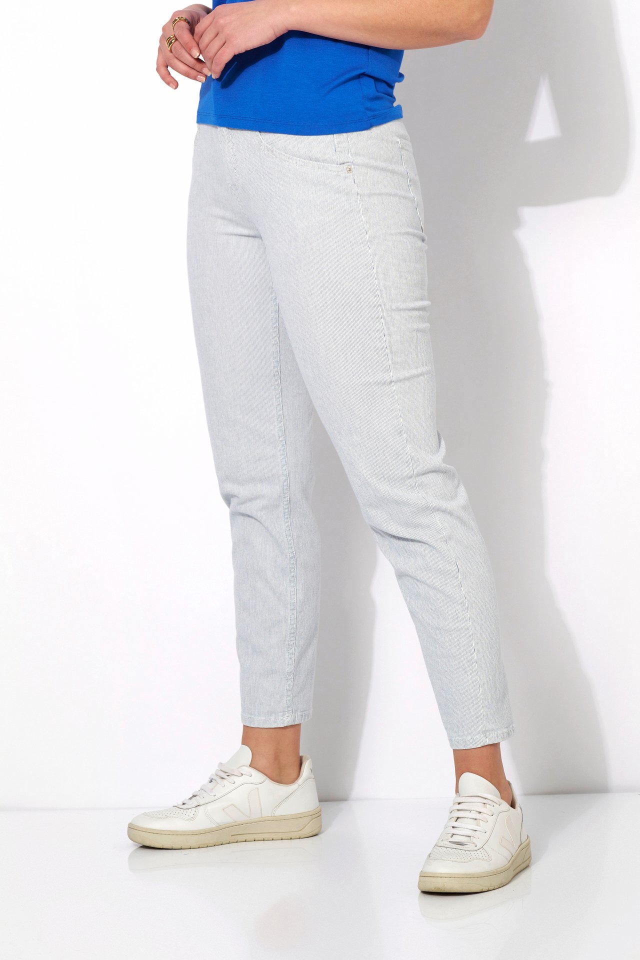 На сайте указаны российские размеры. Свободные джинсы средней посадки с тонкой полоской, средней талией и продуманным решением карманов. Длина по внутреннему шву: 74 см. Рост модели 178 см.