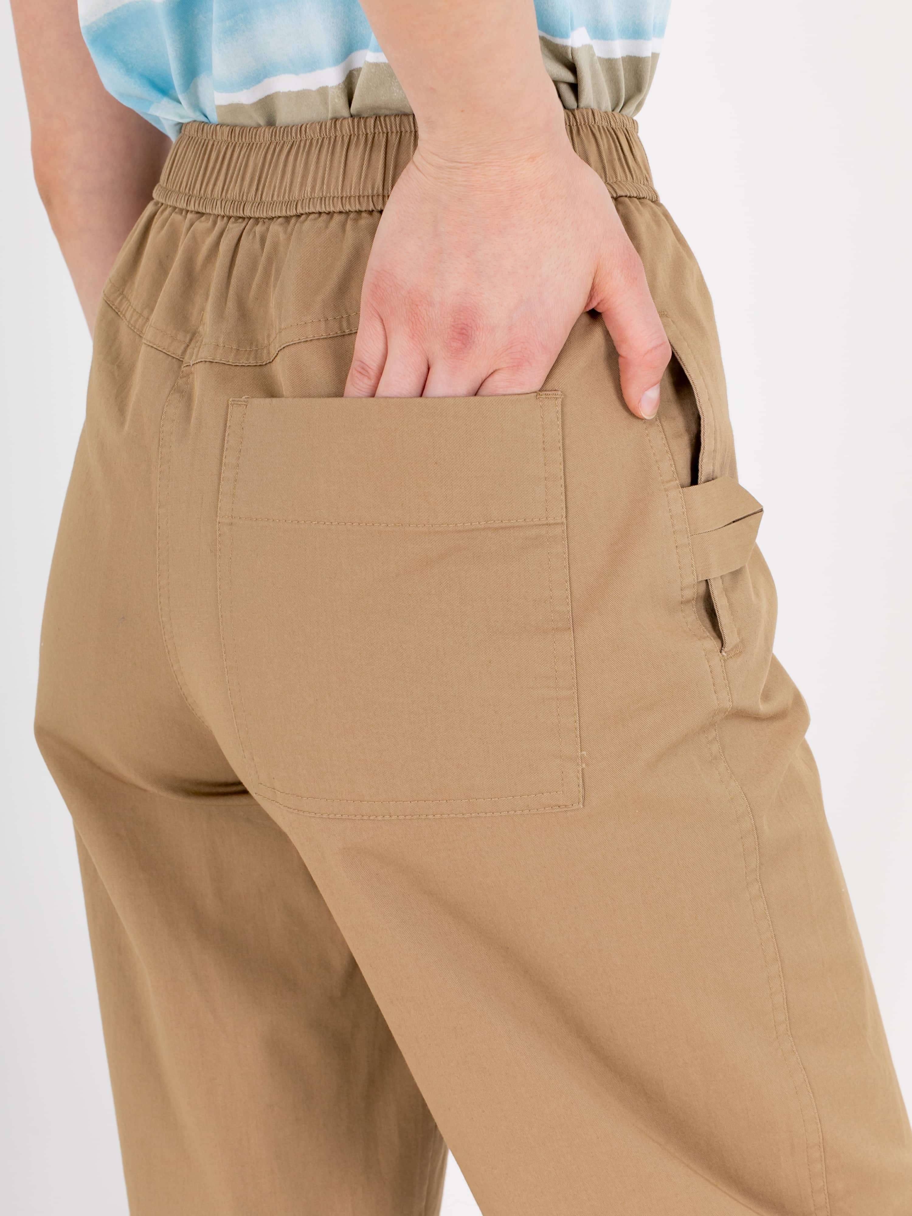 Джинсы «Carrot fit» с завышенной талией длиной до щиколотки с застежкой на молнию и 1 пуговицу. Джинсы слегка зауженные книзу. Два кармана в боковых швах с патами. На задних половинках фигурная кокетка и накладной карман. Верх брюк обработан поясом на резинке со шнуром.