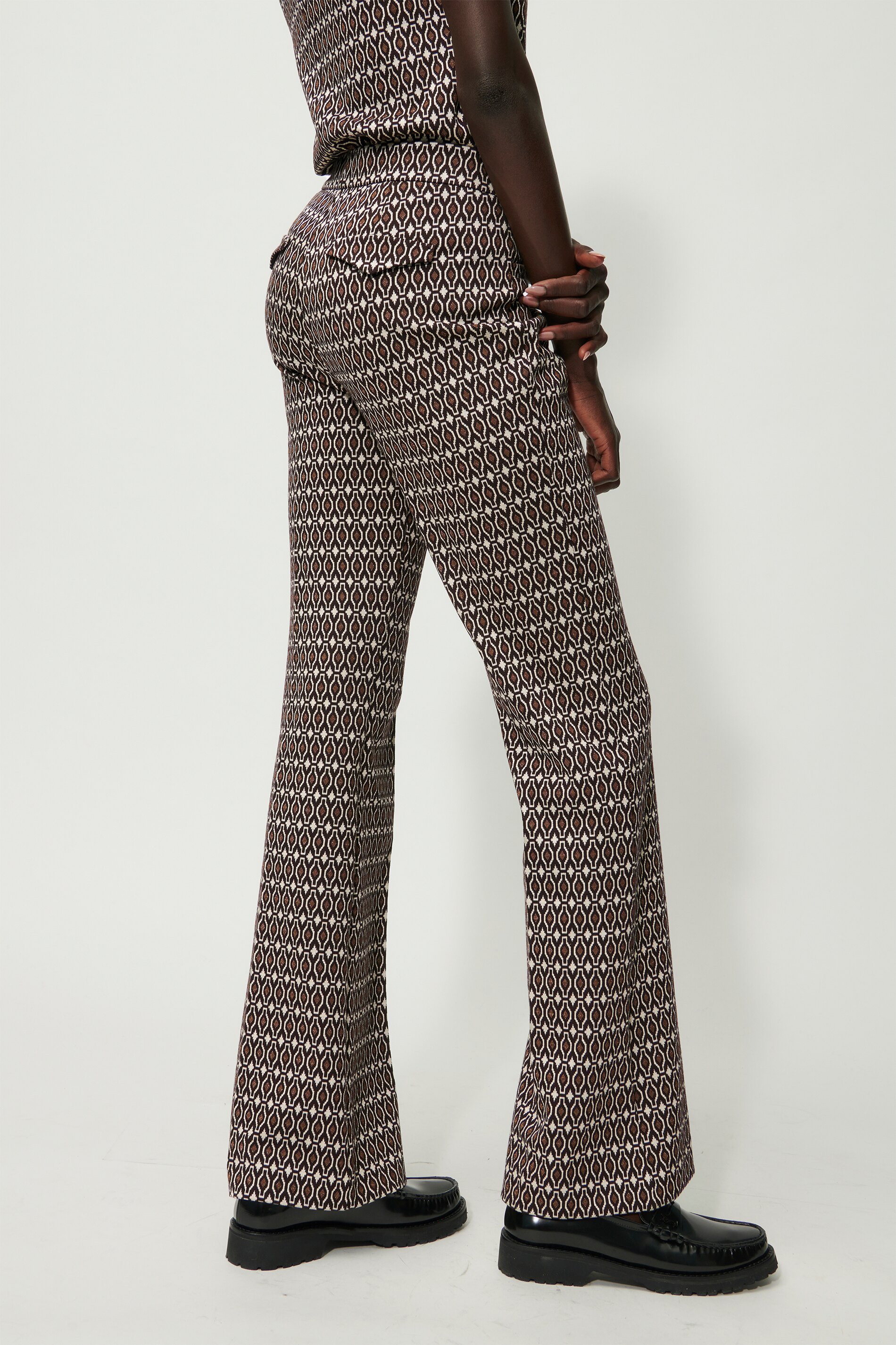 Элегантные расклешенные брюки из мягкого жаккардового джерси с эффектом блесток. Пояс и эластичный материал делают эти брюки особенно удобными.
