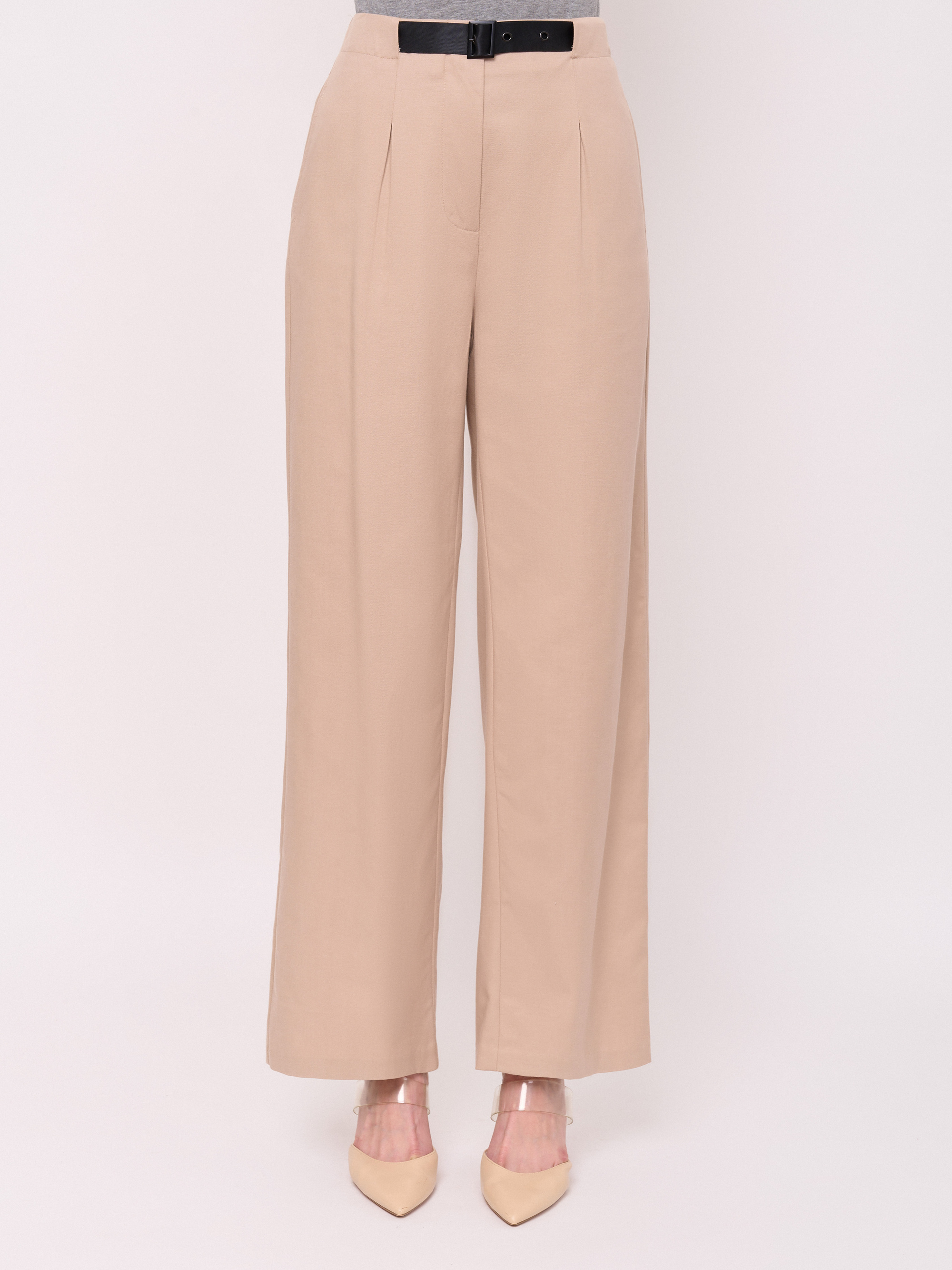 Детали: застежка молния, без рисунка, карманы в шве, крой брючин широкий, посадка средняя, текстильный ремень, складки. Длина брючин: 76. Идеально с жакетом UNQ (арт. 24110010144)