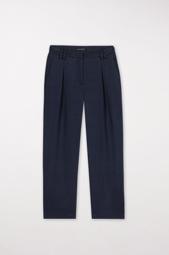 Укороченные брюки слегка зауженного силуэта из мягко струящегося габардина. Особенности включают складки, двойные петли для ремня, боковые карманы и декоративные задние карманы с клапанами.