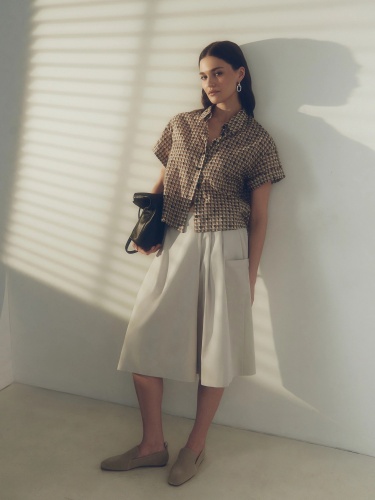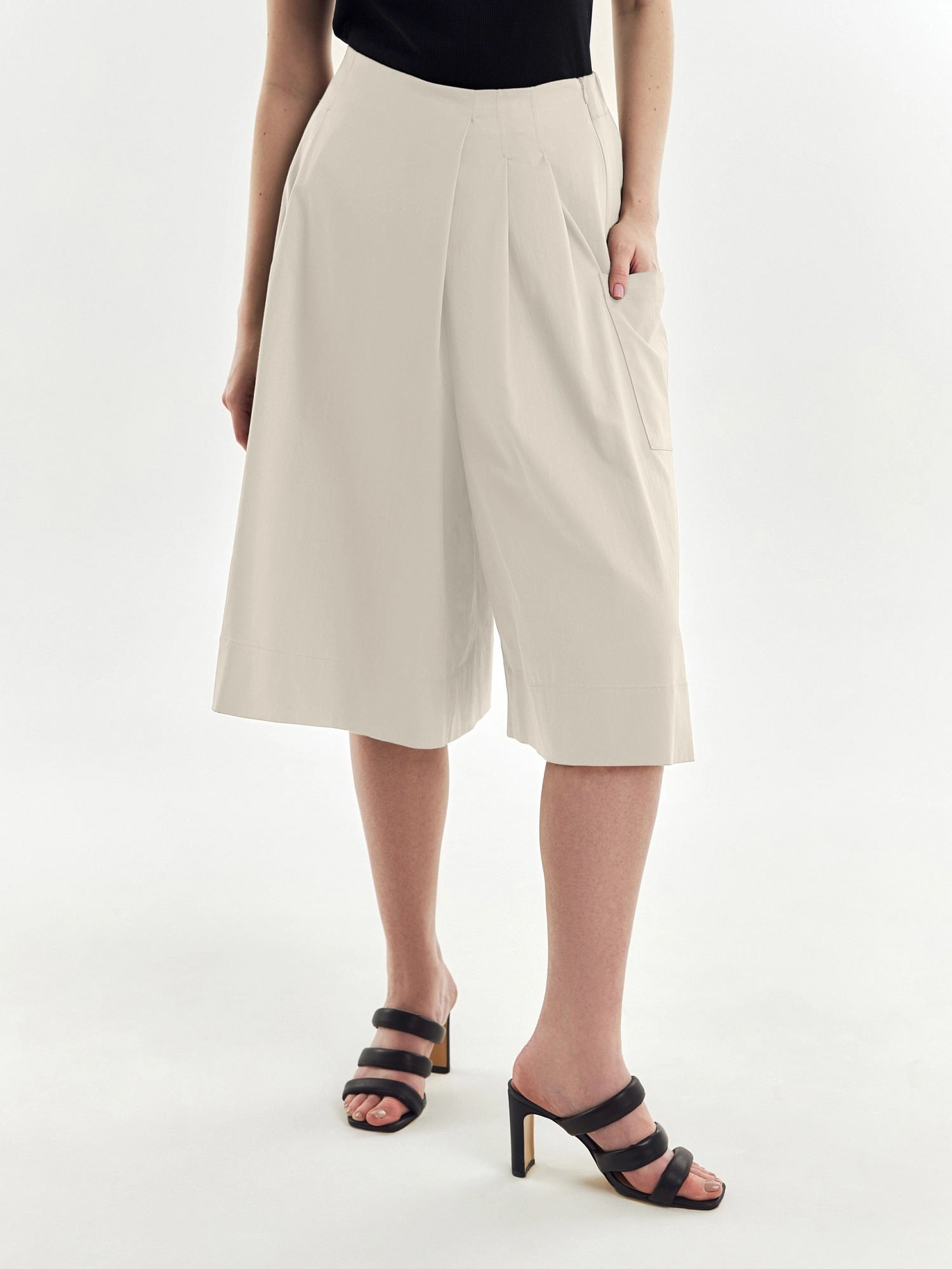Длинные шорты из хлопковой ткани с запахом и складками по переду имитирующими юбку. На спинке резинка для лучшей посадки. Спереди складки, по бокам большие накладные карманы.
