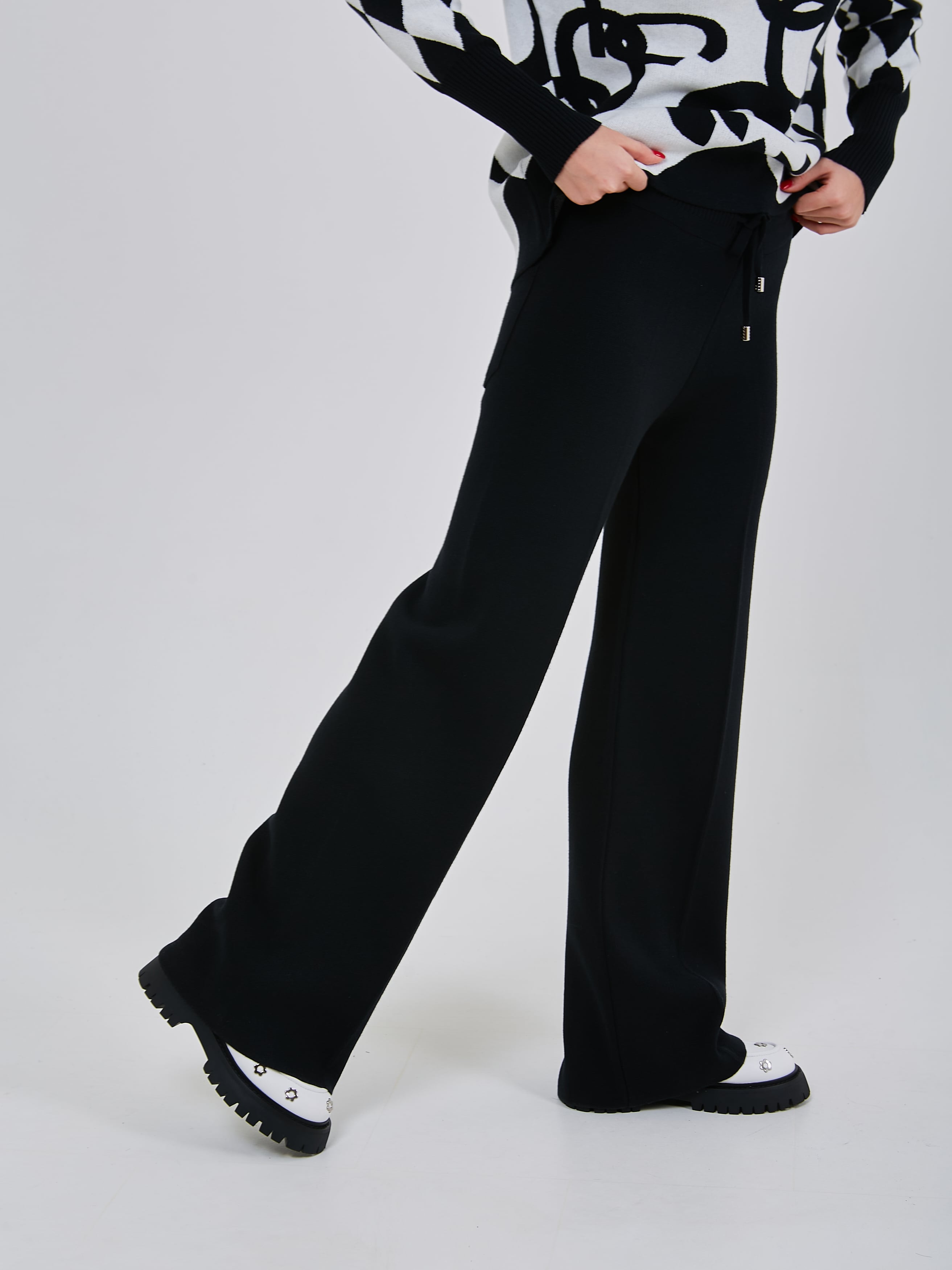 Трикотажные брюки с комфортным поясом на шнурках, дополнены небольшой стрелкой, зрительно вытягивающей силуэт. Осень-Зима'25/26. Капсула "Малахитовая шкатулка"