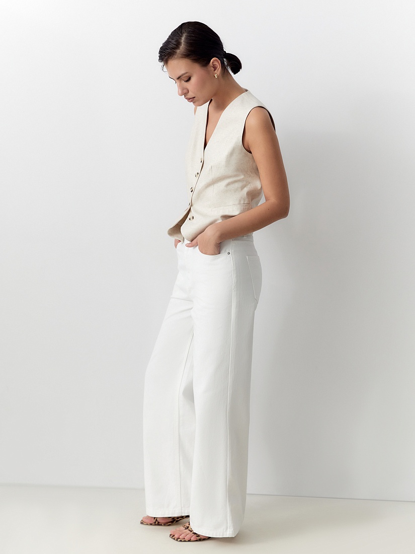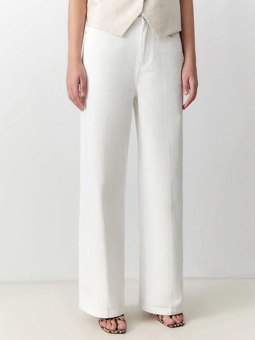 Широкие прямые джинсы из 100% молочного хлопка с твиловым переплетением для лучшей формоустойчивости. Полная длина позволяет носить их с обувью на каблуке. Застежка молния и болт.