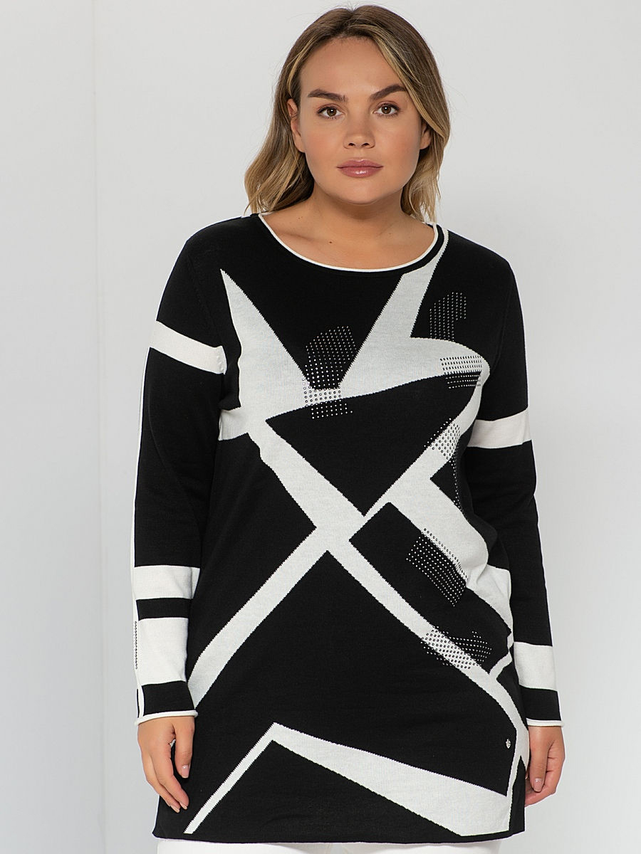 Удлиненный джемпер привлекает внимание своим контрастным геометрическим рисунком. Слегка приталенный силуэт, круглый вырез горловины, втачные рукава полной длины. Декор стразами создает более демократичный образ. Материал из хлопковой смеси приятен к телу и удобен в ношении.