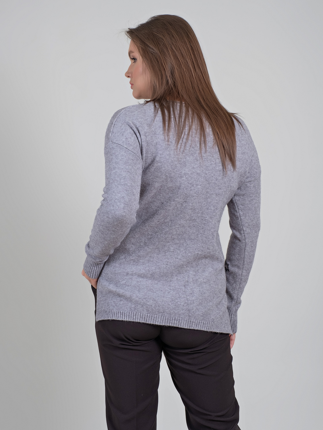 В мягком джемпер будет тепло и уютно холодной зимой. Оригинальный звездный принт придаст неформальность образу.Овальная горловина, втачной рукав полной длины со спущенным плечом, удлиненная спинка. Спереди имеется два накладных кармана.