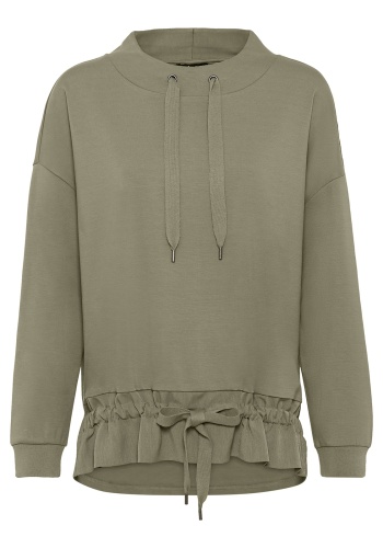 Однотонный джемпер с оборкой на кулиске по низу изделия. Базовый цвет хаки хорошо комбинируется с разными цветовыми решениями. Круглый вырез горловины с кулиской. Длинные втачные рукава с эластичными манжетами, спущенная линия плеч.