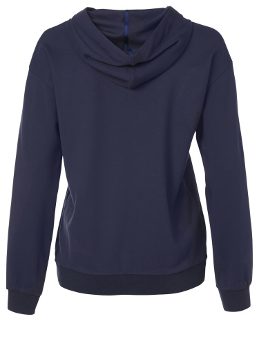 Однотонная толстовка насыщенного синего оттенка с оригинальным принтом на груди. Прямой силуэт, эластичная резинка по низу изделия. Капюшон на кулиске с широким шнурком в тон изделия. Спущенная линия плеч, длинные втачные рукава.