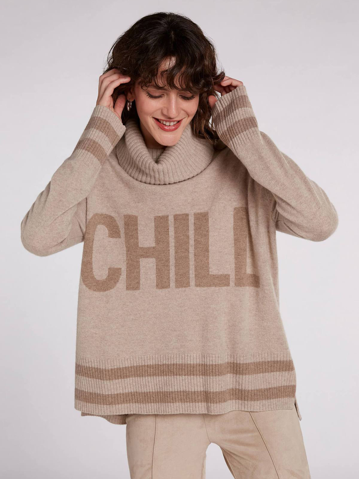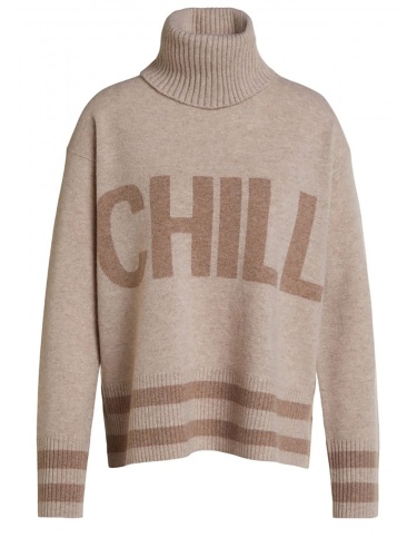 Пуловер базовой бежевой расцветки с оригинальной надписью спереди. Свободный силуэт, прямой крой, линия плеч спущена. Объемный воротник стойка, длинные втачные рукава с манжетами в рубчик.