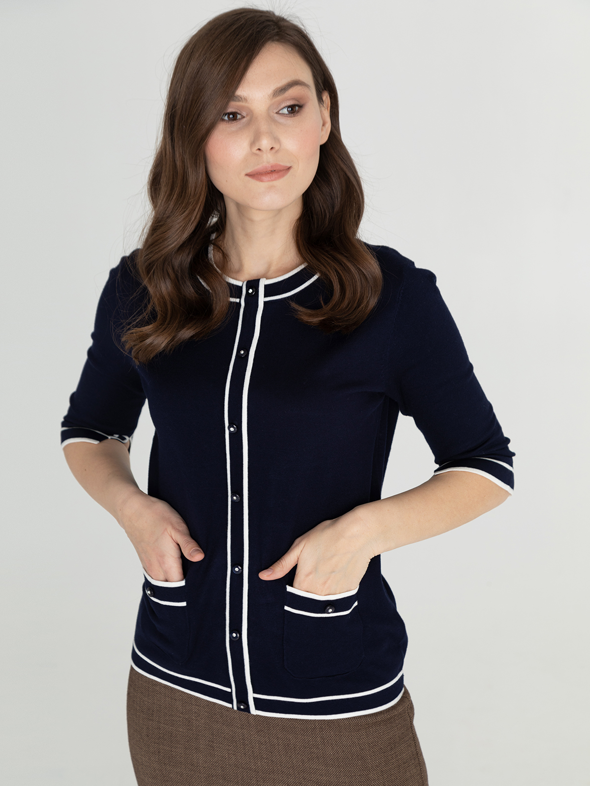 Элегантный темно-синий джемпер с контрастной отделкой по контуру изделия. Круглый вырез горловины, планка с пуговицами. Короткие втачные рукава, два накладных кармана спереди.