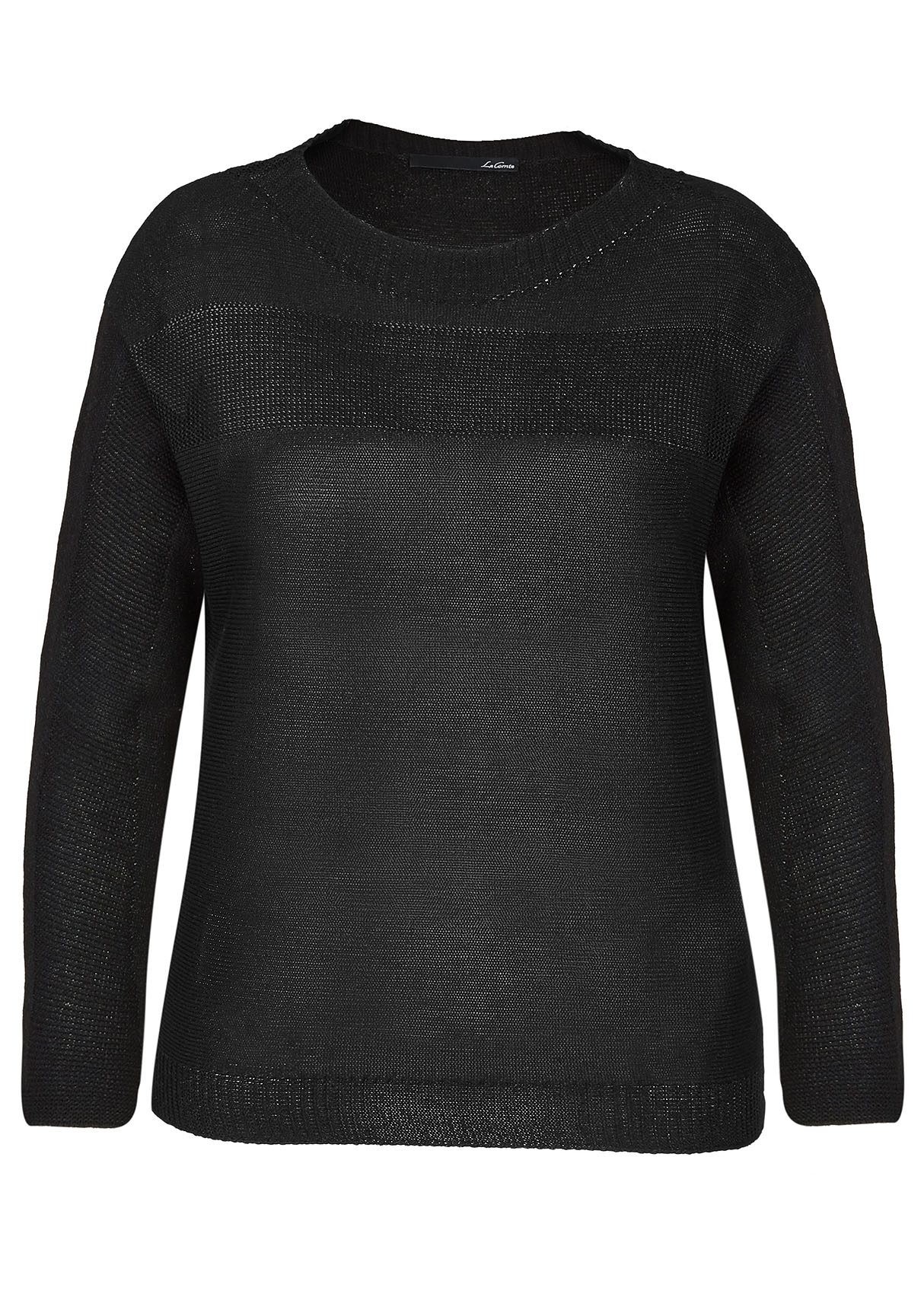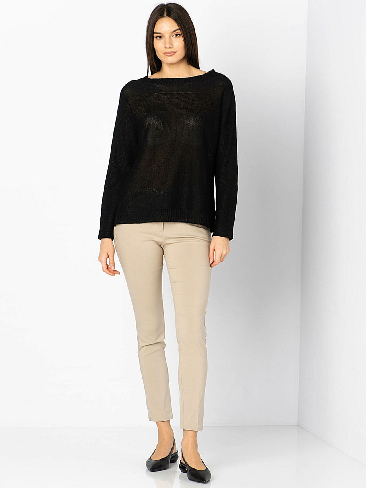 Приятный к телу джемпер из вискозы и полиэстера. Свободный покрой. Вырез "лодочка", длинные рукава. Небольшие разрезы по бокам. Длина изделия по спинке: 65 см.
