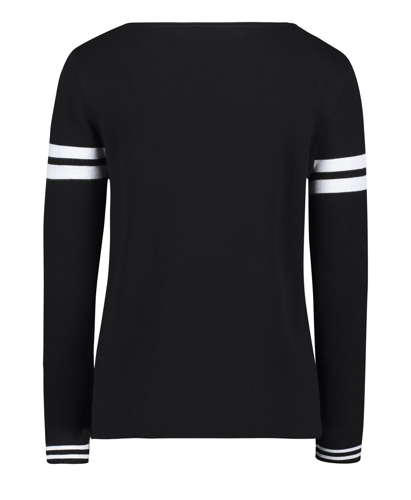 Необычное сочетание цветов, надписи и полоски, и все в одной вещи! Поэтому черно-белый дизайн совсем не выглядит скучно. Джемпер прямого покроя с длинными рукавами и вырезом горловины "лодочка". Материал из хлопково-вискозной смеси приятен к телу и обеспечивает комфорт. Этот джемпер - отличный выбор для прогулки прохладным летним вечером.