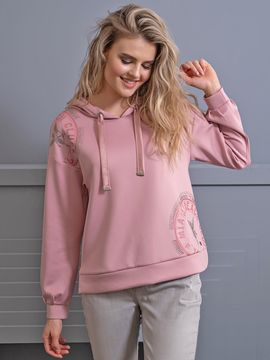 На сайте указаны Российские размеры. Толстовка выполнена в нежно-розовой расцветке и украшена декором в виде страз. Капюшон регулируется кулиской. Втачной рукав полной длины со спущенной линией плеч. Эластичная лента по низу изделия. Толстовка прекрасно дополнит джинсы или юбку-миди.
