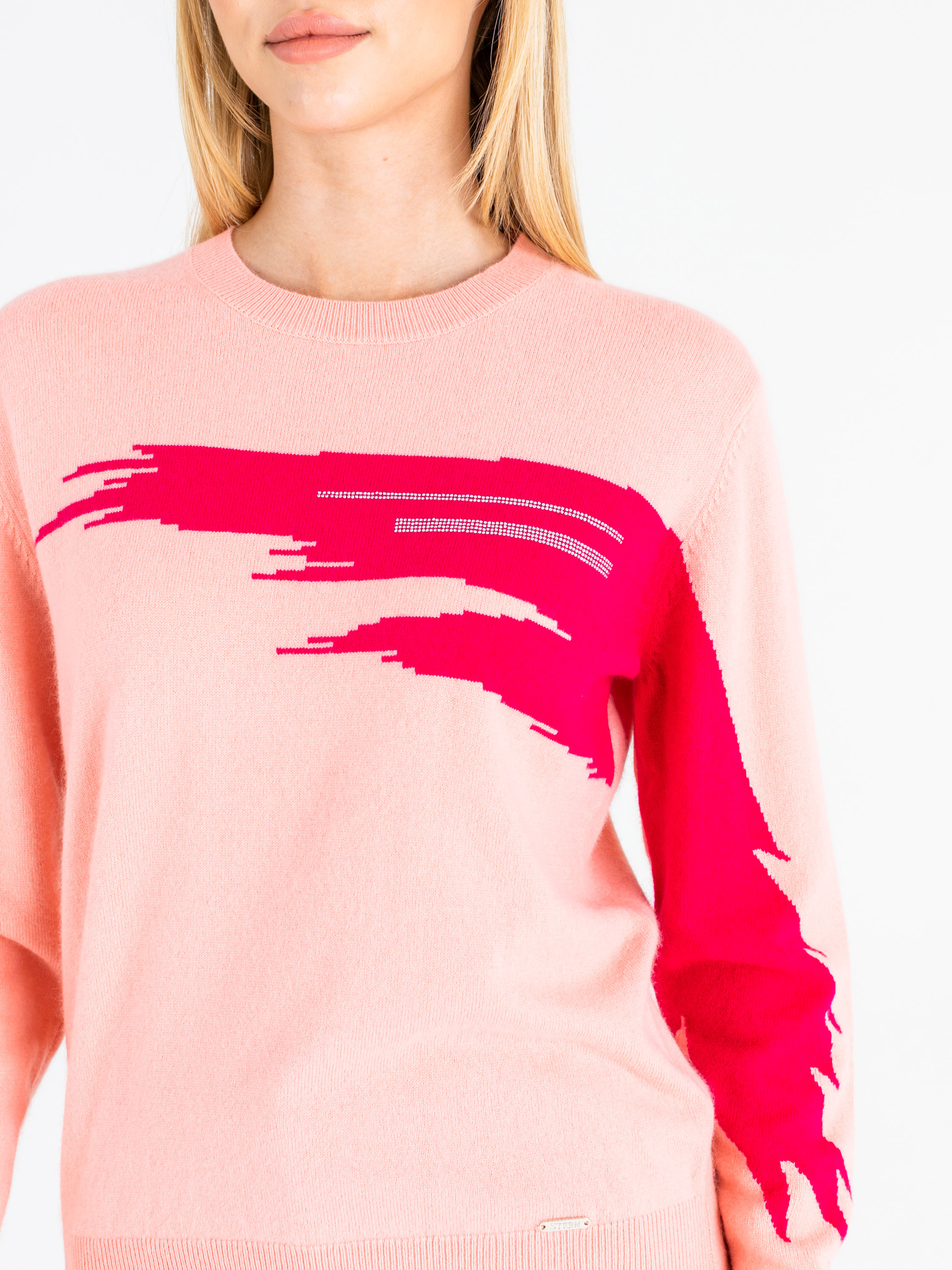 На сайте указаны российские размеры. Ткань: смесовая ткань средней плотности. В составе: 27% вискоза, 27% нейлон, 23% ангора, 23% шерсть. Крой: джемпер слегка приталенного силуэта с круглым вырезом и длинным рукавом. Комфортный материал, где за мягкость отвечает вискоза, а за тепло – ангора и шерсть. Резинки на манжетах и конце изделия обеспечивают надежное прилегание, Резинки на манжетах и конце изделия обеспечивают надежное прилегание, не открывают зону живота, что особенно актуально в холодное время года. Представлен в двух стильных оттенках – голубом и розовом. Отделка: художественная абстракция может восприниматься по-разному: для одних это мазок кисти художника, для других – хвост кометы. Небольшая дорожка страз добавляет звёздного сияния, делая вас – главной звездой этого дня. Джемпер украшен фирменным шильдиком. С коллекцией брюк и юбок для создания образа с джемпером можно познакомиться в соответствующих разделах нашего сайта. Рост модели - 177 см