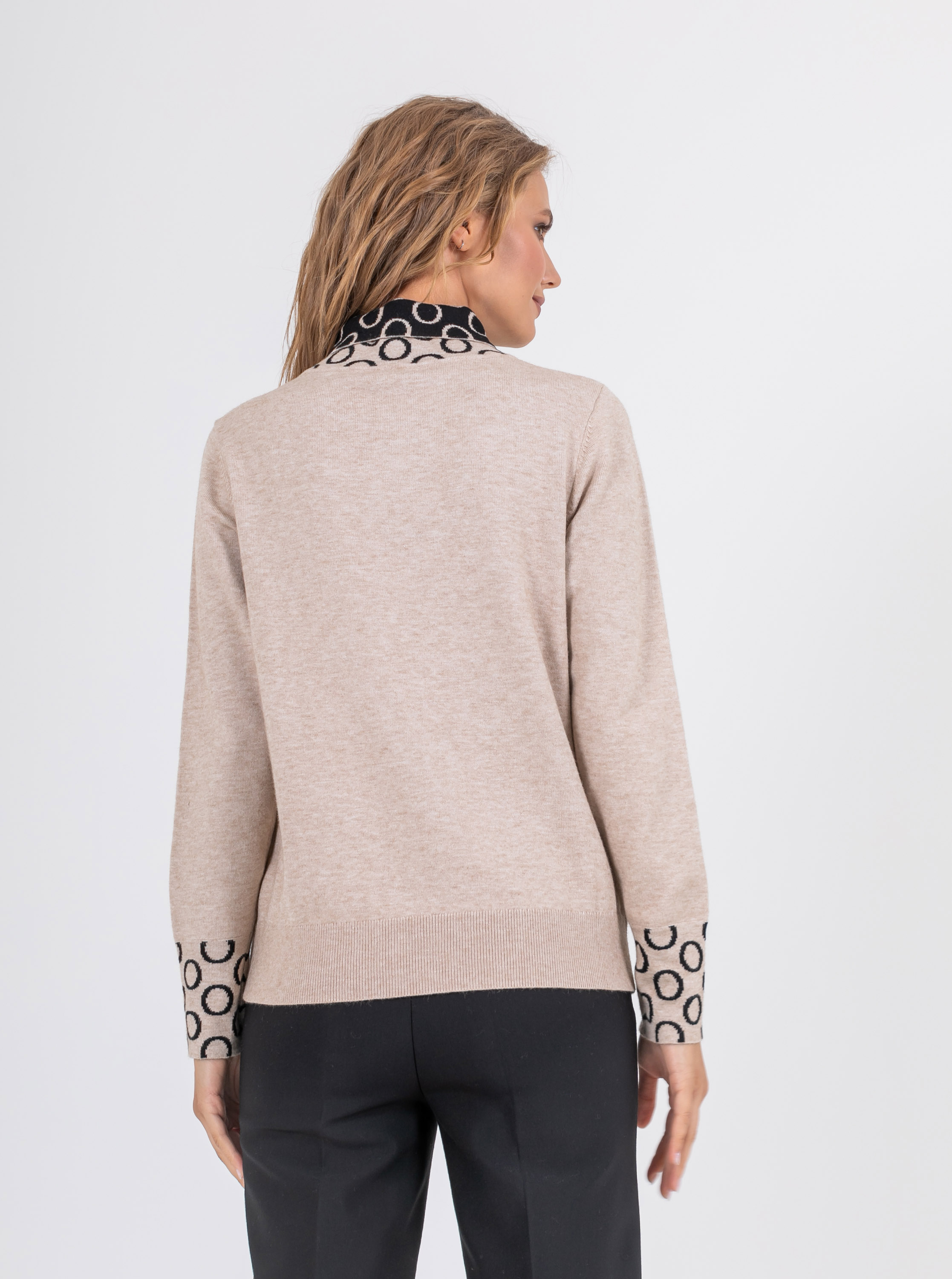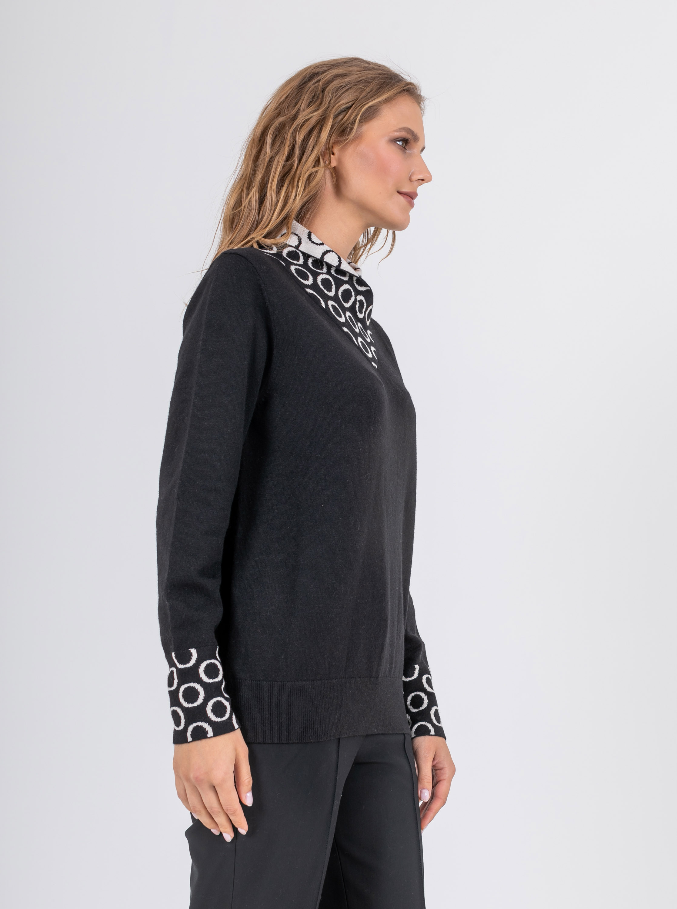 На сайте указаны российские размеры. Ткань: выполнен из качественного гладкого трикотажа. В составе 6% шерсть,10% нейлон, 59% полиэстер, 10% вискоза. Крой: слегка приталенный джемпер из гладкого трикотажа средней плотности. Женственная, подчеркивающая все достоинства фигуры модель создает гармоничный и спокойный образ, который захотят повторить. Оригинальный ворот выделяется своей необычной конструкцией и подчеркивает красоту шеи. Длинные, чуть свободные рукава с манжетом-резинкой, не сковывают движения, дарят комфорт и тело. Джемпер представлен в двух стильных цветах – черном и бежевом. Отделка: двусторонний ворот, сложенный изящным уголком, поражает воображение: контраст двух цветов, усиленный узором «круги», делает образ запоминающимся и на 100% стильным. Цветовое решение поддерживают и рукава с тем же принтом. Сочетайте с однотонными вещами из коллекции Stern, чтобы не смещать фокус внимания с красивой отделки джемпера. Рост модели: 174 см Длина по спинке: 60 см