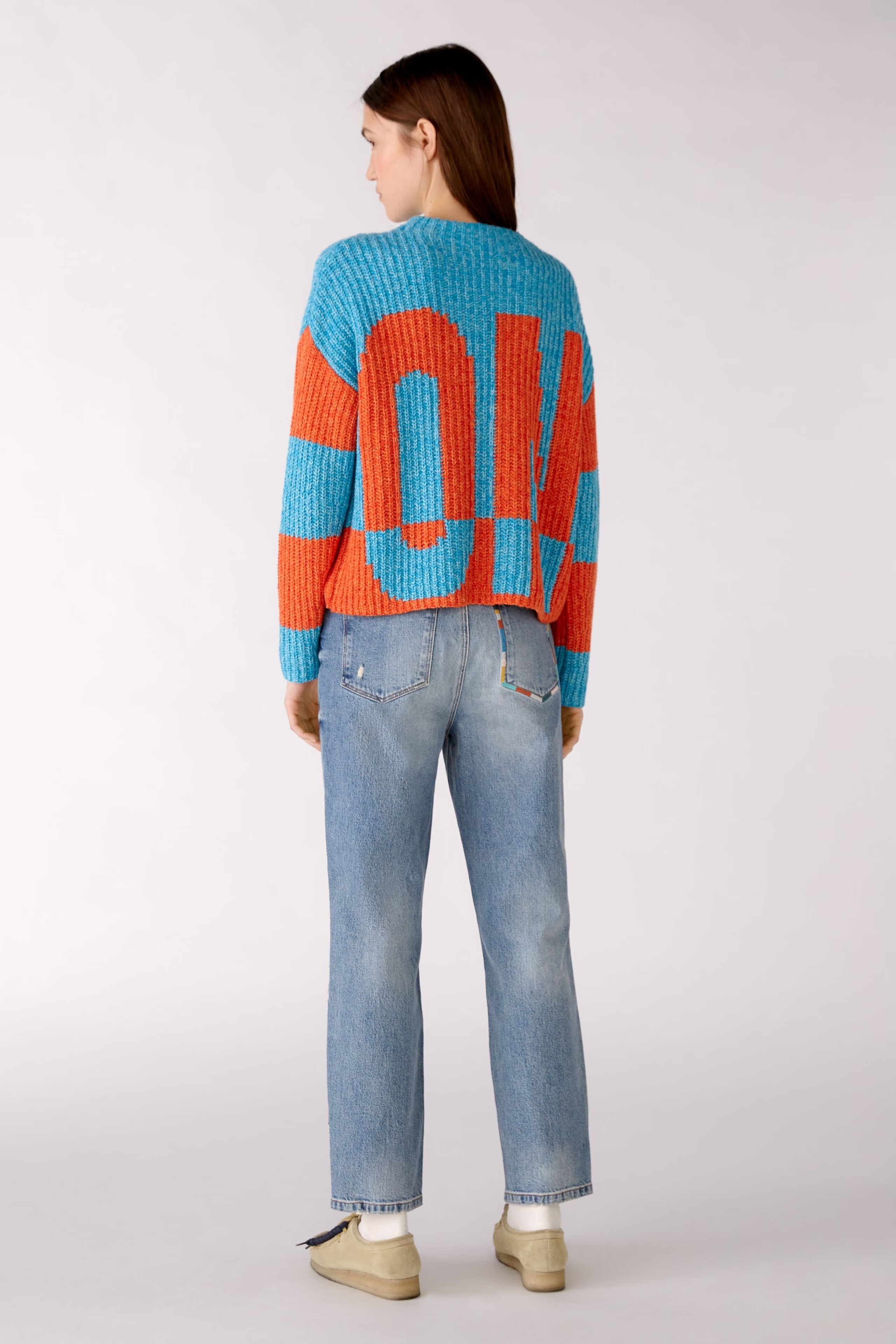 На сайте указаны российские размеры. Хлопковая смесь грубой вязки. Эффект цветных блоков в сочетании с пряжей мини-букле в стиле мулине. Покрой оверсайз со спущенными плечами. Неброские рукава и концы кромки.