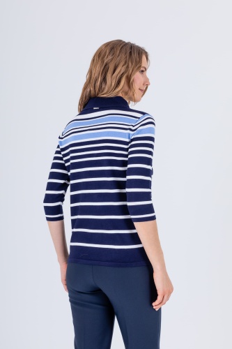 На сайте указаны российские размеры. Джемпер средней длины прямого силуэта из легкой, мягкой вискозы с добавлением нейлона, дизайнерская особенность модели – принт в полоску. Втачные рукава ¾. Воротник «хомут» с декоративной петелькой.