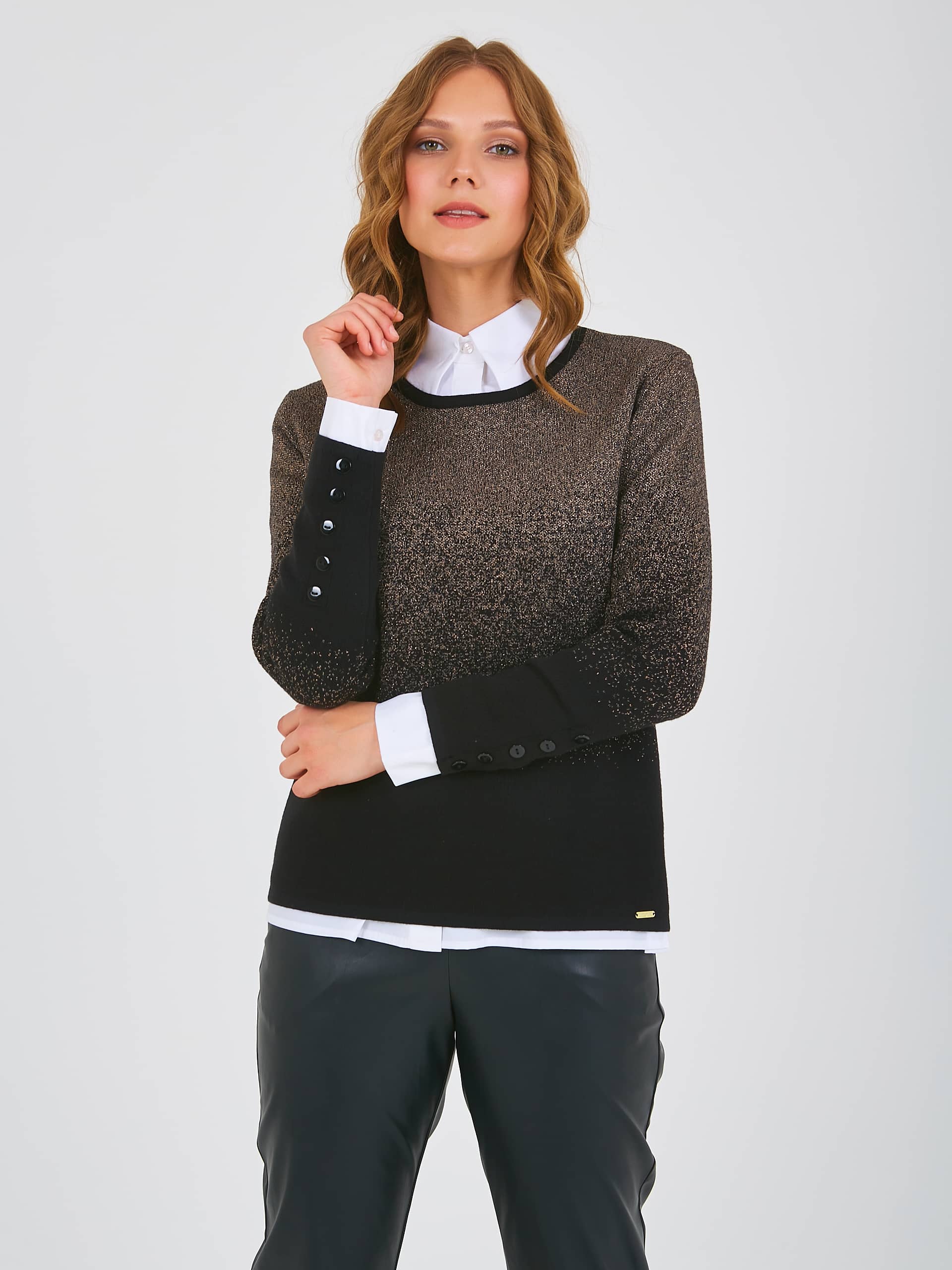 Джемпер средней длины прямого силуэта из легкого хлопка с добавлением акрила и люрекса, дизайнерская особенность модели – рисунок из нитей люрекса в виде градиента. Длинные втачные рукава с имитацией шлицы и 5 декоративными пуговицами. Круглый вырез горловины.