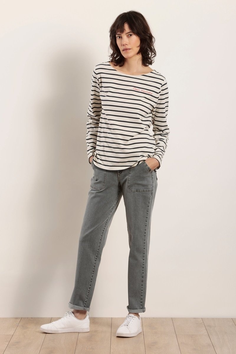 Джемпер из органического хлопка с вышивкой. Прямого покроя. Круглый воротник. Длинные рукава. Контрастная вышивка Coeur Marinière на груди. Вышивка в виде сердца на правом плече и спине. Шелкография на левом рукаве. Небольшой боковой разрез внизу изделия. Длина: 57,5 см для размера 44.