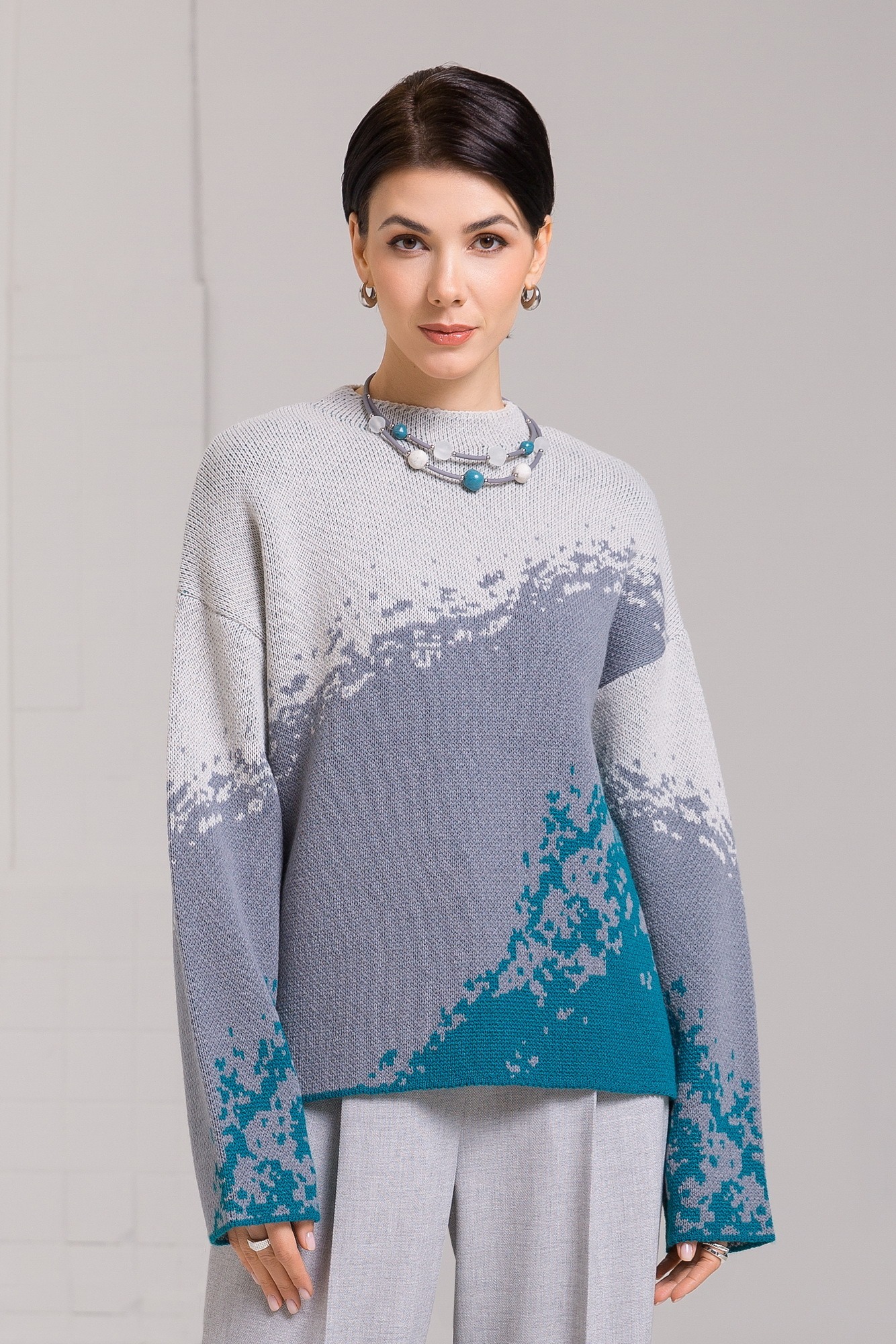 Оригинальный пуловер в технике неполного жаккарда выполнен из сияющего сочетания глубоких зеленых и серых оттенков.