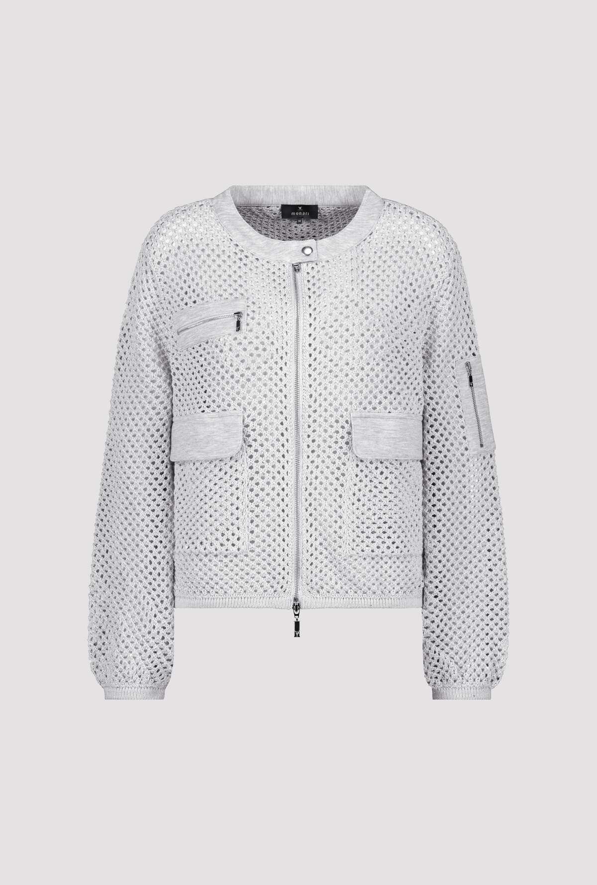 Современный кардиган из высококачественной смеси хлопка с блестящей люрексовой пряжей и ажурным узором. Регулярная посадка. Круглый вырез горловины с кнопкой. Длинный рукав. Ребристые манжеты и подол. Карман на молнии на левой руке. Ложный нагрудный карман на молнии. Двусторонняя молния. Длина 44 размера 52 см.
