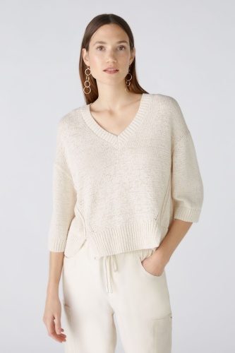 Укороченный свитер из ленточной пряжи с красивыми деталями, такими как убавки и вязаный шов на спине. Ленточная пряжа, гладкая, из смесового хлопка. Повседневный крой, укороченная длина. Глубокий женственный V-образный вырез со спортивной ребристой отделкой. Вырезанное плечо, свободно ниспадает на 3/4 руки. Расширенные боковые швы с разрезами в рубчик, высокий нижний край. Длина для размера 42: 50 см.