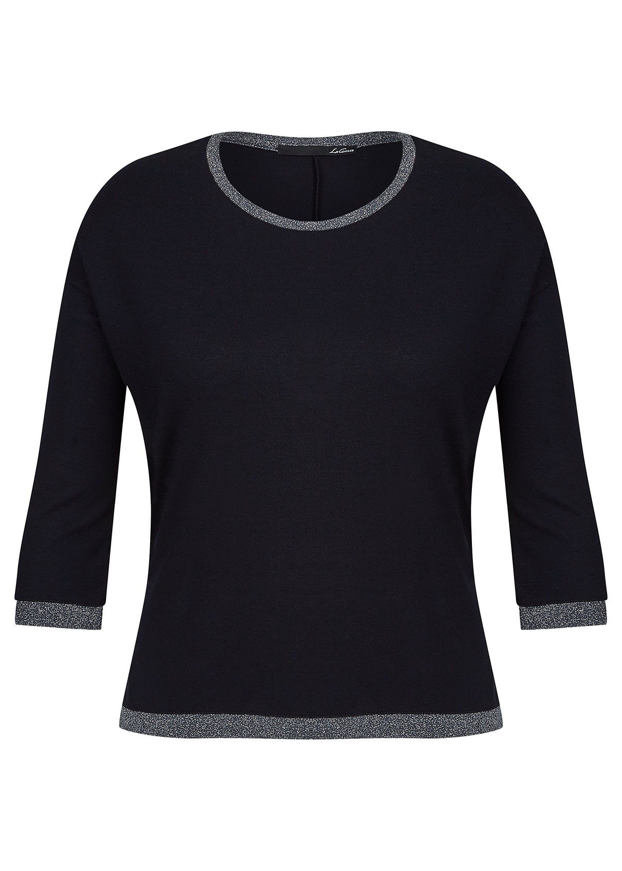 Джемпер прямого покроя. Удлиненная спинка, рукав 3/4 со спущенным плечом, разрезы по бокам. Контрастная отделка с вплетением нити люрекса. Материал из смеси вискозы с полиэстером и эластаном приятен к телу.