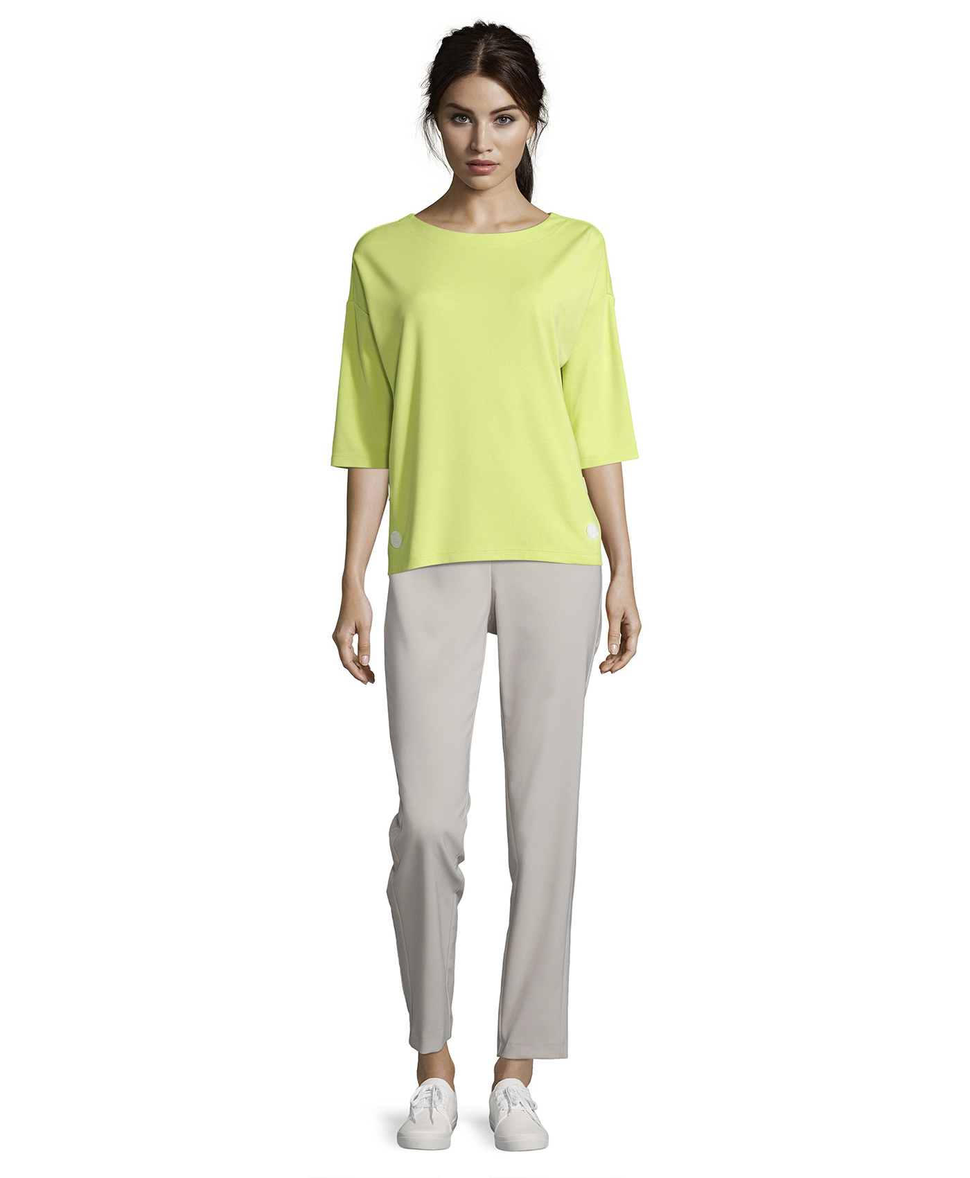 Универсальная модель - однотонный джемпер прямого покроя. Круглый вырез горловины с элегантными завязками на спинке, рукава 1/2 со спущенным плечом. Декоративные пуговицы по бокам. Материал из вискозной смеси приятен к телу и обеспечивает комфорт. С этой лаконичной моделью вы можете создать множество стильных комплектов одежды.