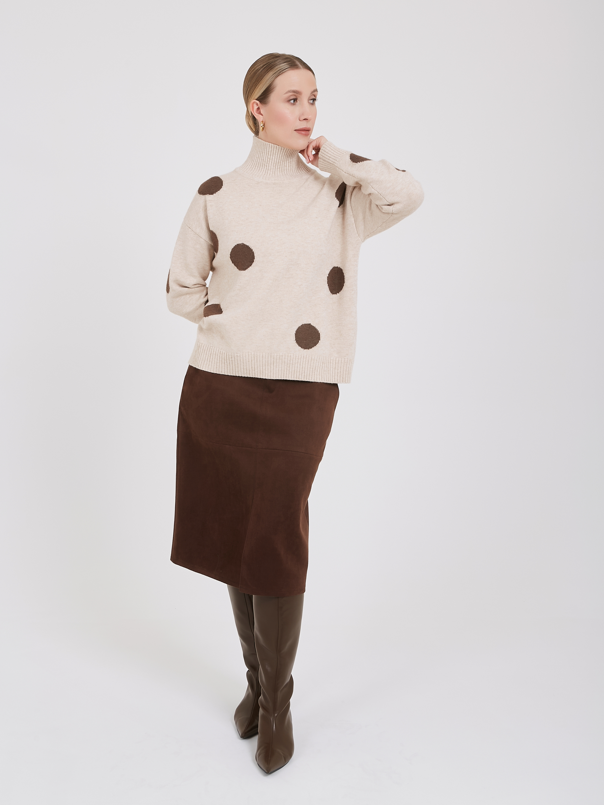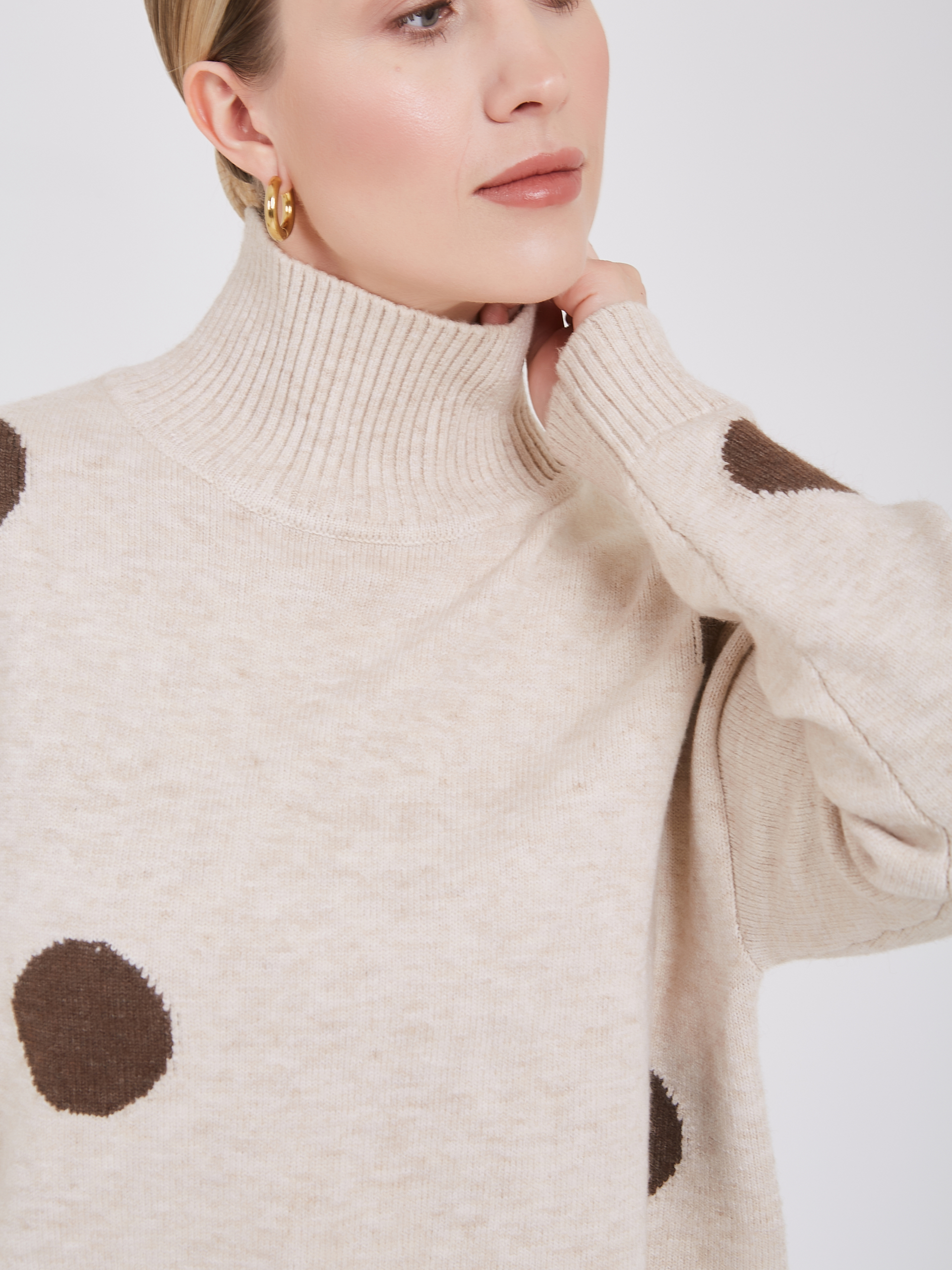 Женский свитер с высоким воротником и свободным кроем. Узоры в виде горошин равномерно распределены по всей поверхности свитера, придавая ему игривость и оригинальность. Материал высокого качества подчеркивает комфорт и удобство в повседневной носке. Осень-Зима'25/26. Капсула "Вино из одуванчиков"