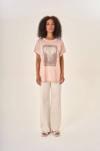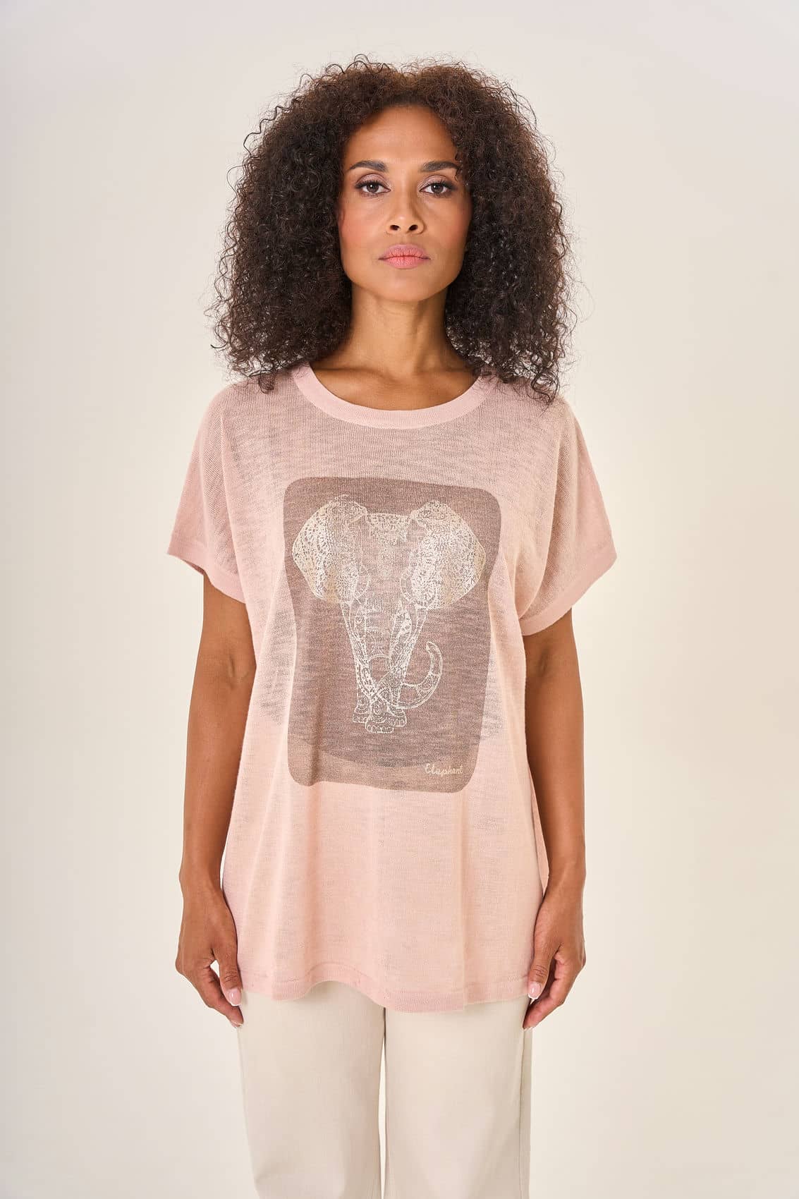 Свободная блузка пастельно-розового оттенка с коротким рукавом и круглым вырезом. Центральное внимание привлекает крупный прямоугольный принт на передней стороне — изящный рисунок слона, выполненный в стилистике классической гравюры. Изящный дизайн и приятный к телу материал делают эту блузку идеальным выбором для создания легкого и романтичного образа.