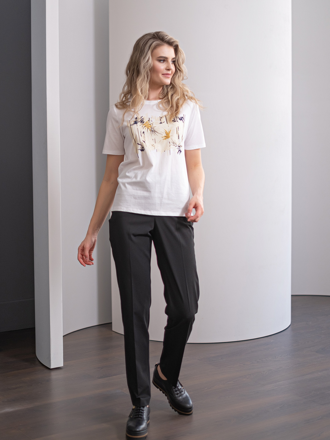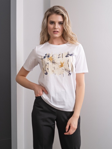 На сайте указаны российские размеры. Ткань: выполнена из 100% гладкого хлопка высокого качества. Крой: слегка приталенная модель, подчеркивающая достоинства фигуры. Имеет круглый вырез и втачной рукав-реглан. Футболка выполнена из гладкого, приятного телу хлопка, который дарит максимальный комфорт – не натирает и не раздражает кожу. Отделка: природный принт украшен золотистым калиброванным бисером, который служит дорогим акцентом всему образу. Сочетается с брюками, джинсами, юбками и шортами из ассортимента Stern.